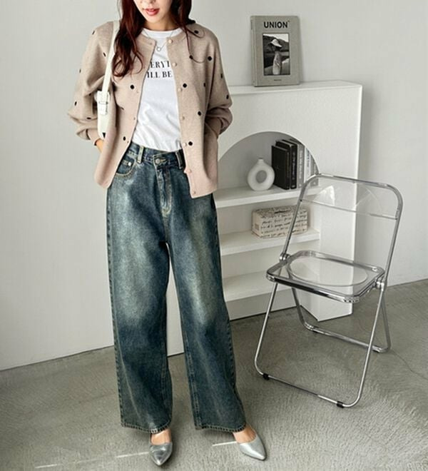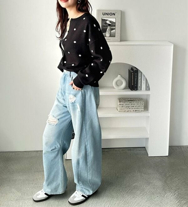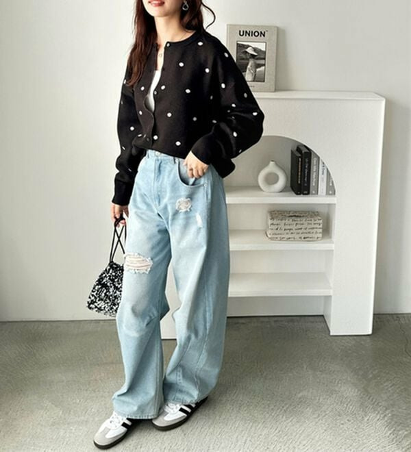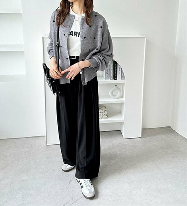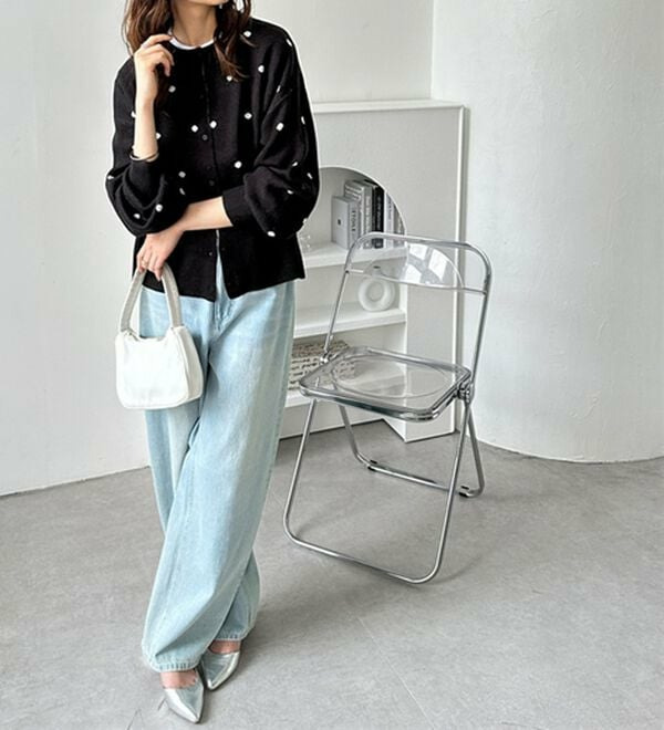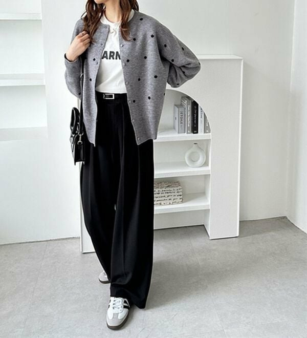 ドット柄がスタイリングにアクセントをつけてくれるので、シンプルなアイテムと好相性!