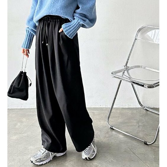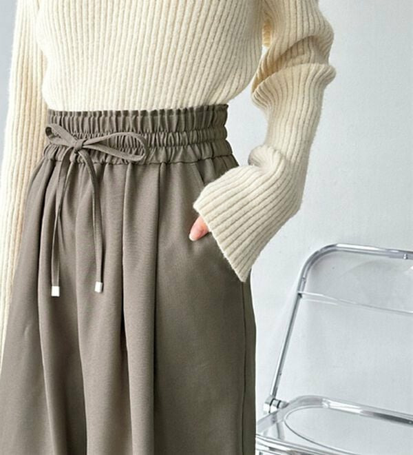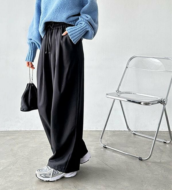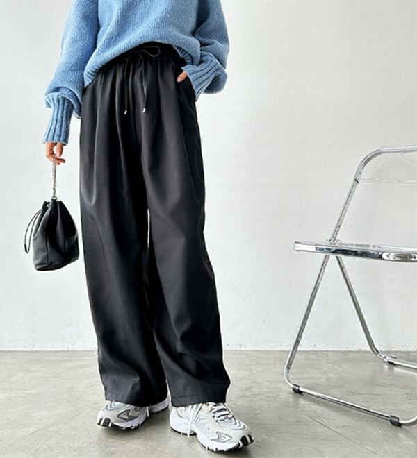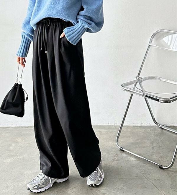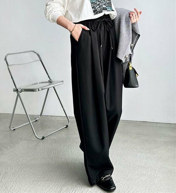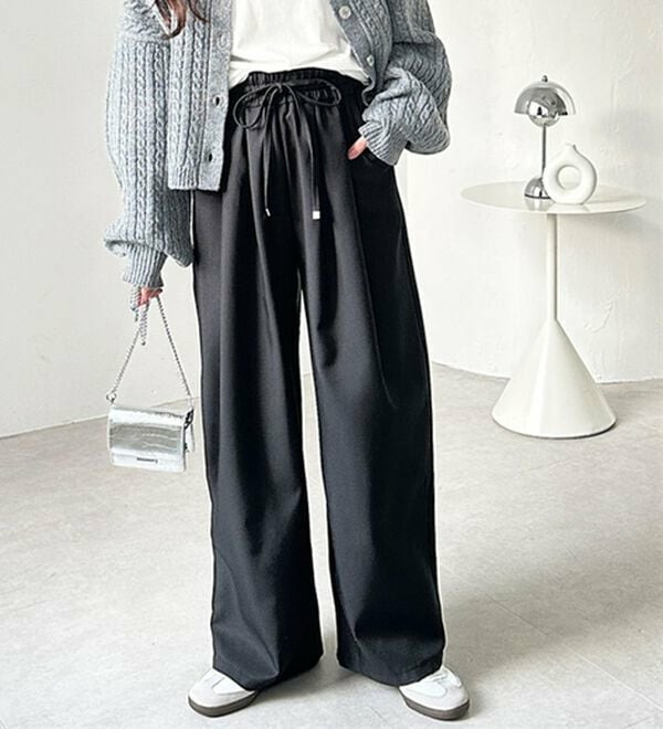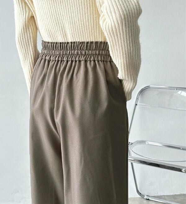ゆったりワイドシルエット&総ゴム仕様で楽な穿き心地ながらも、美脚見えするデザイン。