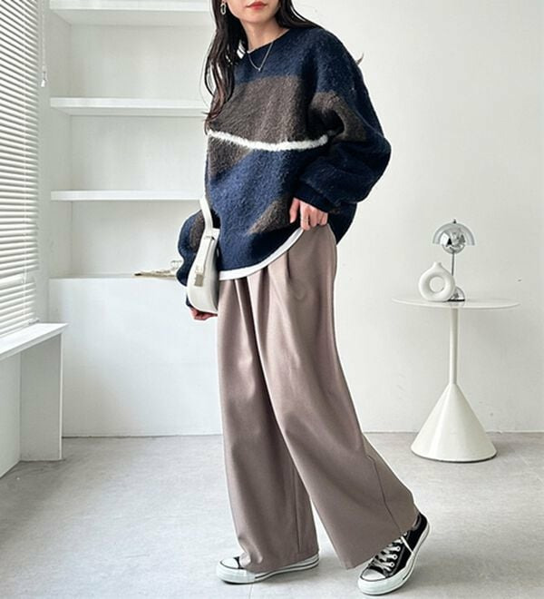 〇ボディラインを拾いにくくストンと落ちる太めのワイドシルエット