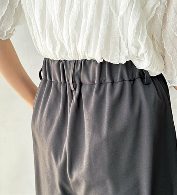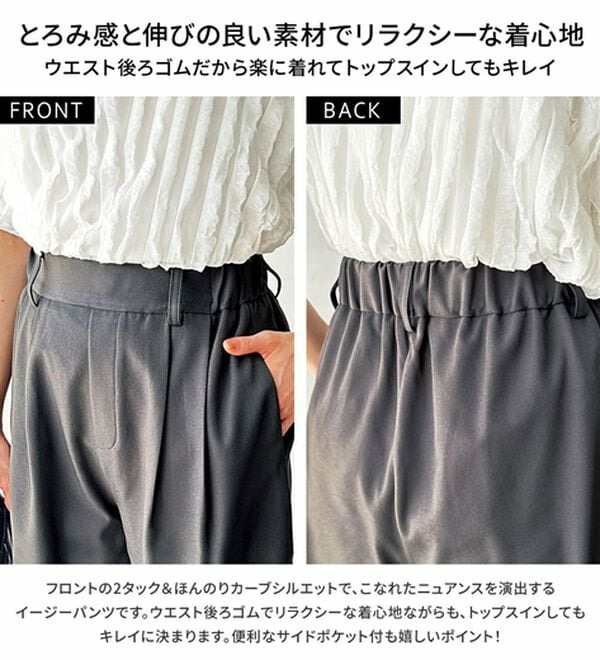 ウエスト後ろゴムでリラクシーな着心地ながらも、トップスインしてもキレイに決まります。