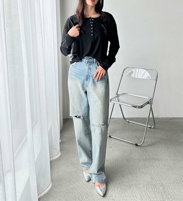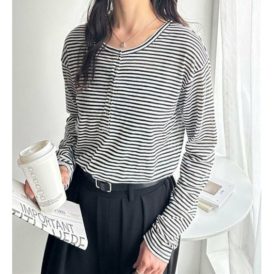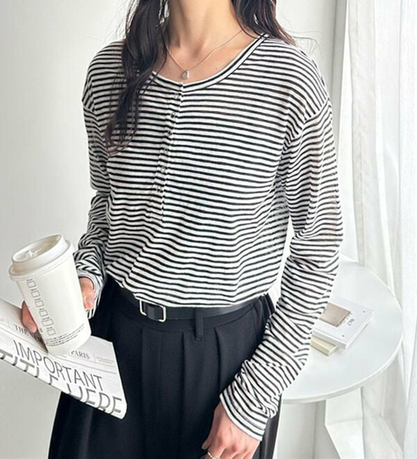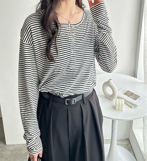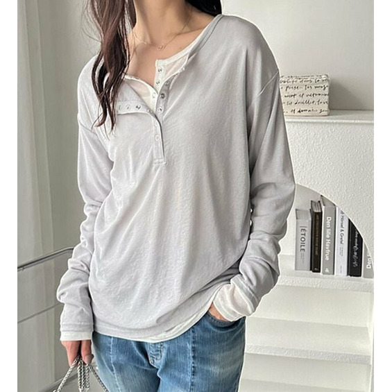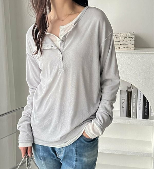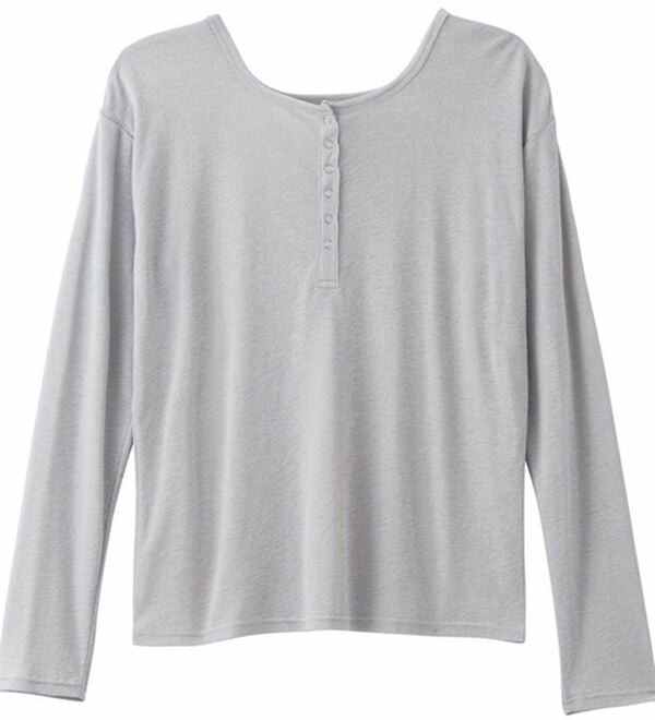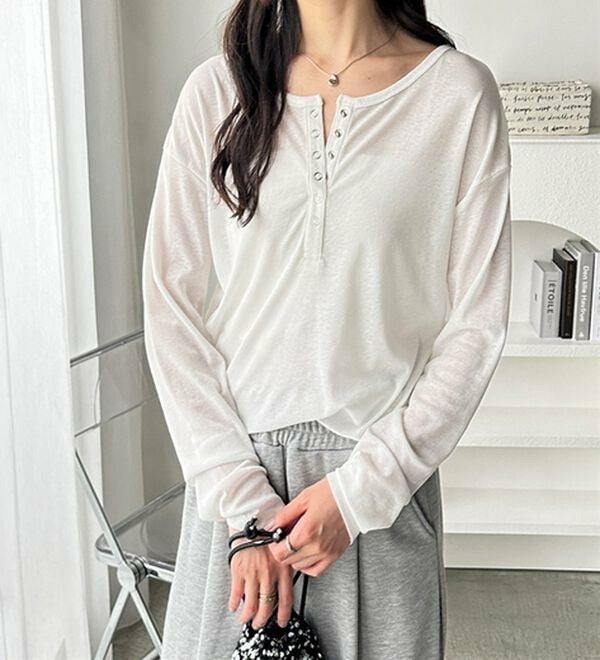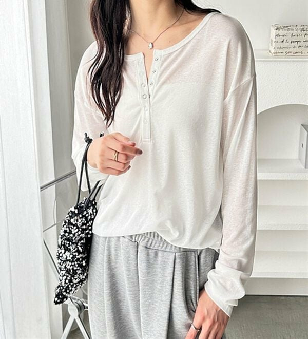 スラブ感のあるシアー素材が今年らしいヘンリーネックカットソー。