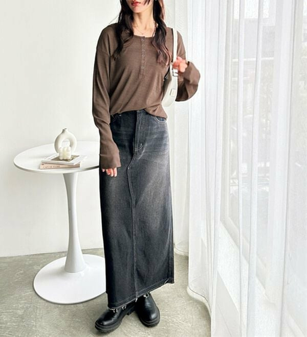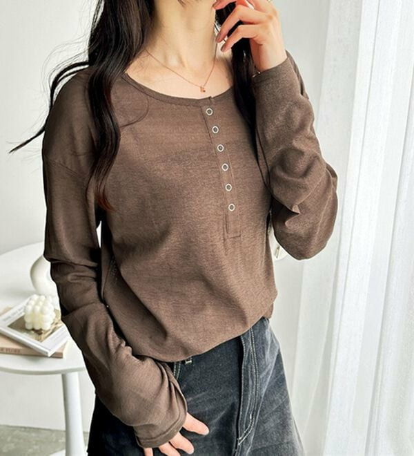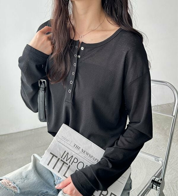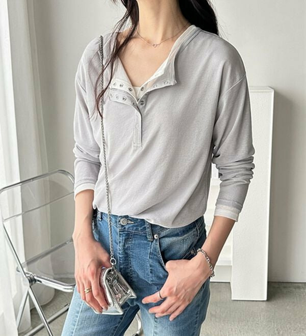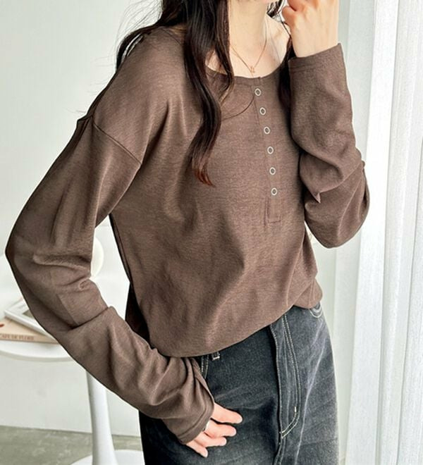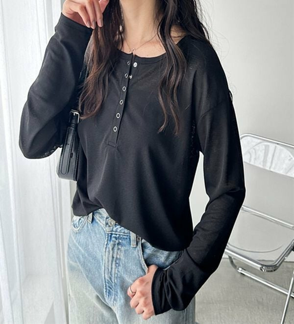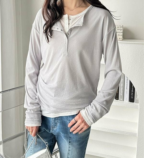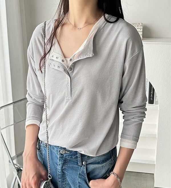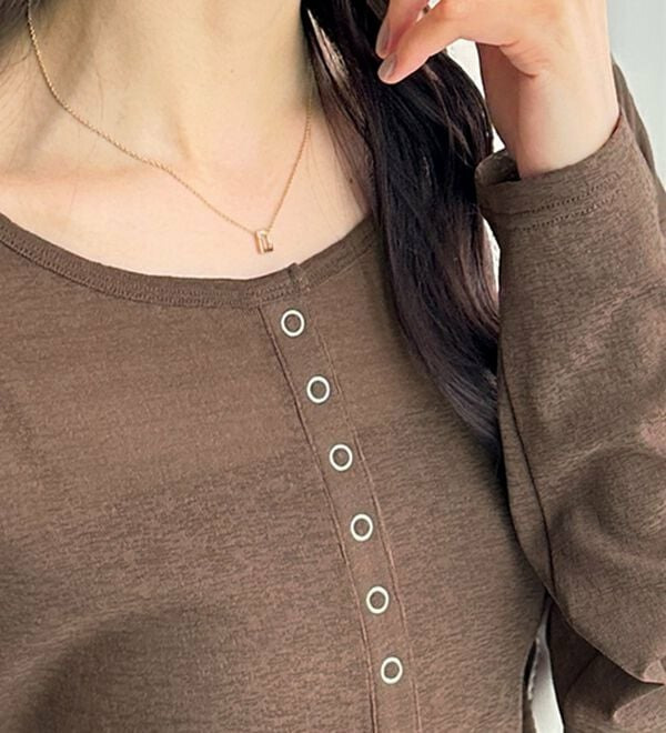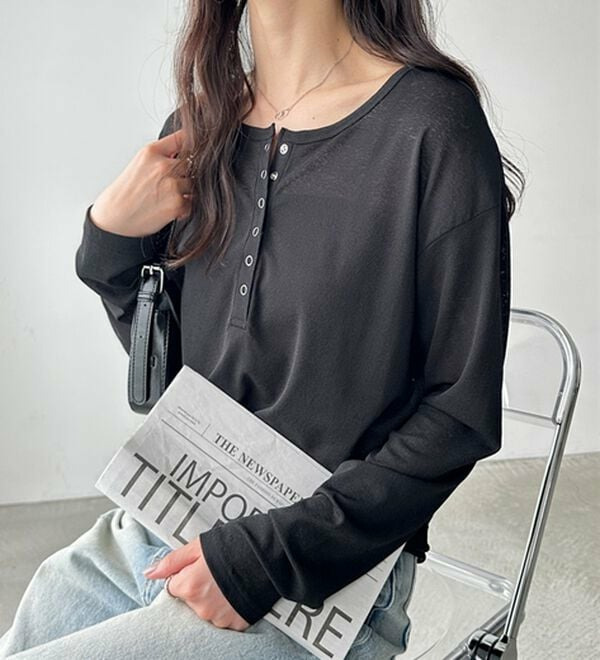〇スナップボタンのヘンリーネックデザインが今っぽい