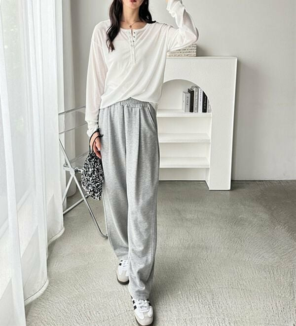 落ち感と伸縮性のあるカットソー素材の、楽ちんな着心地も魅力。