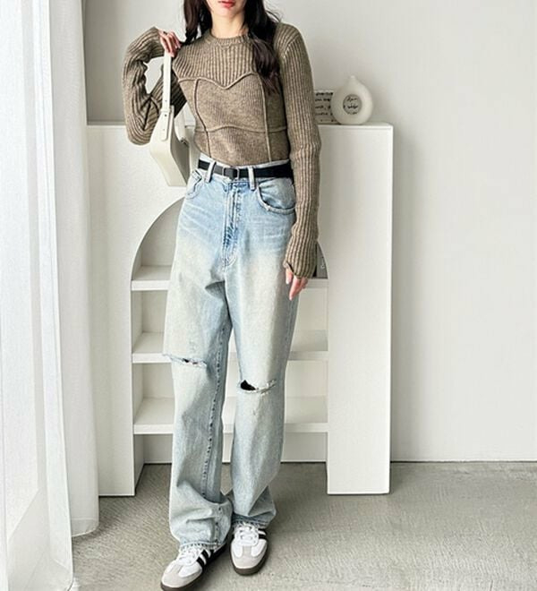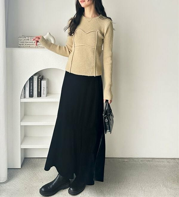 ビスチェをレイヤードしたようなスタイリングの主役になるニット。