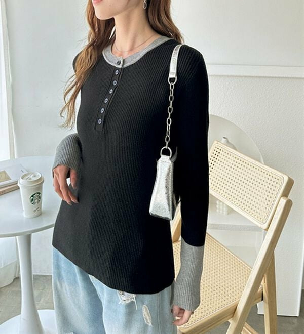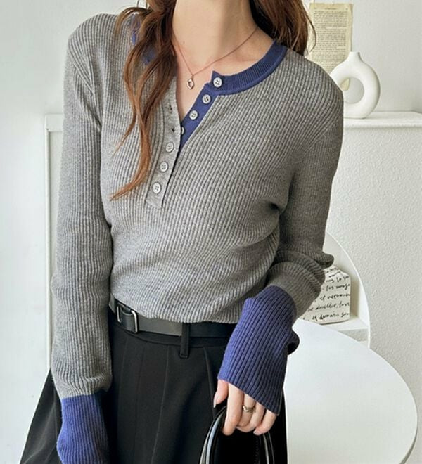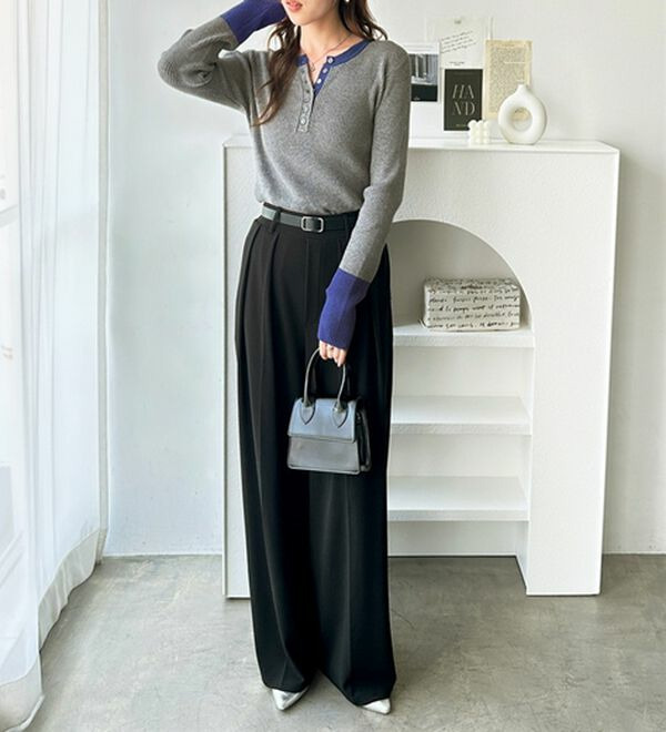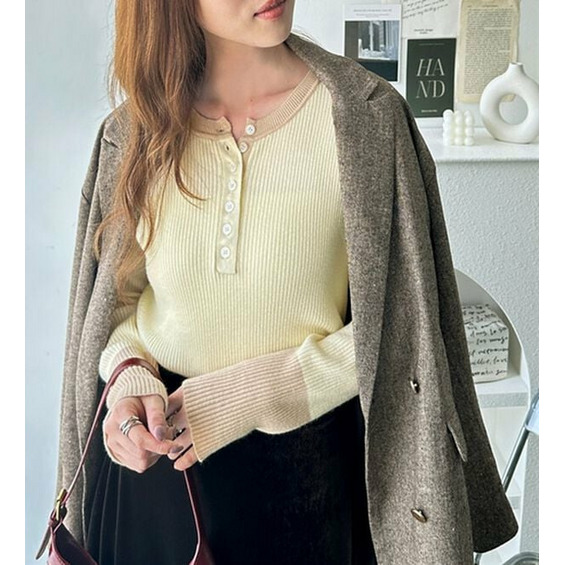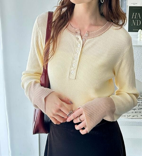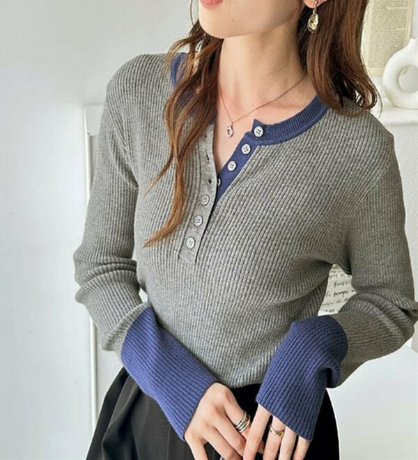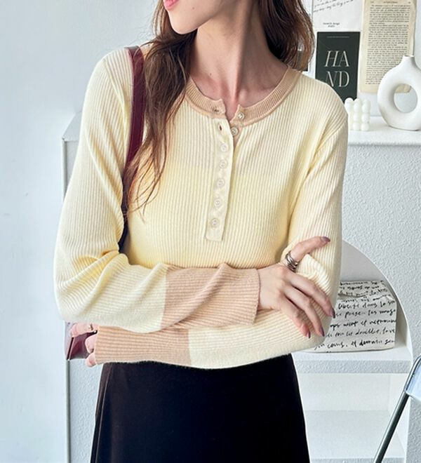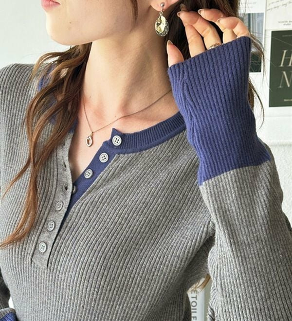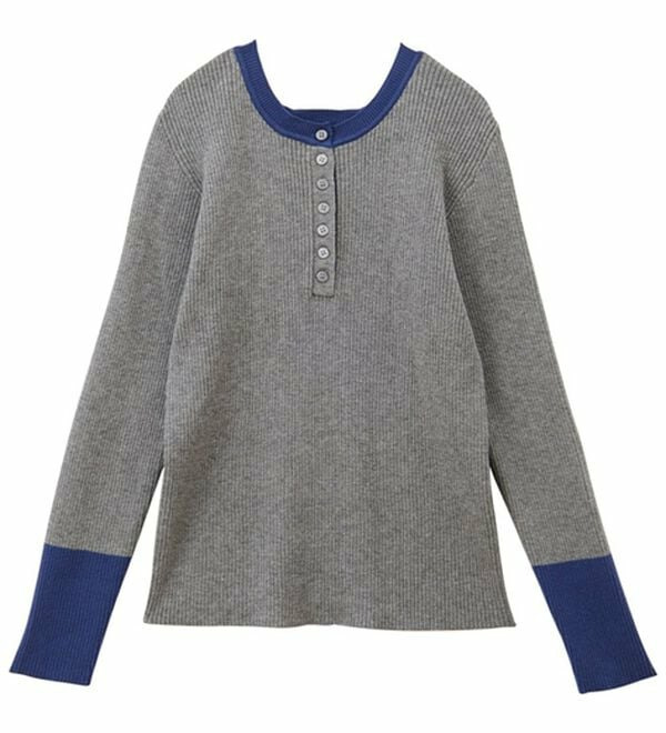 レイヤード見えする配色デザインで、こなれ感のあるヘンリーネックニット。