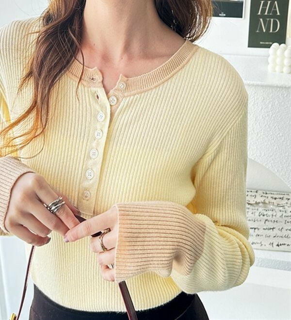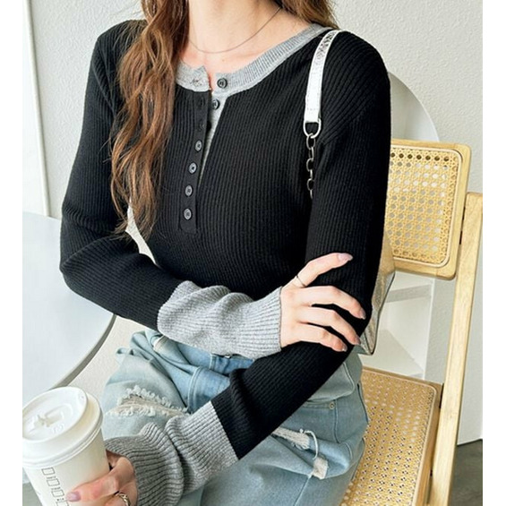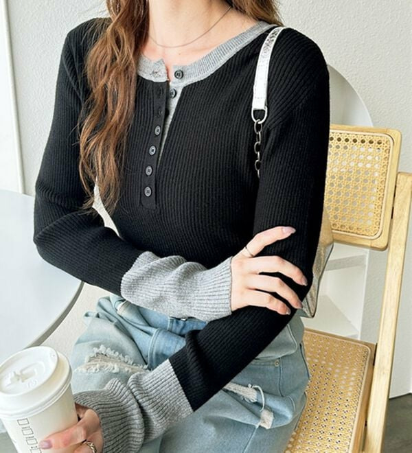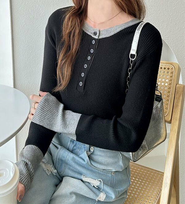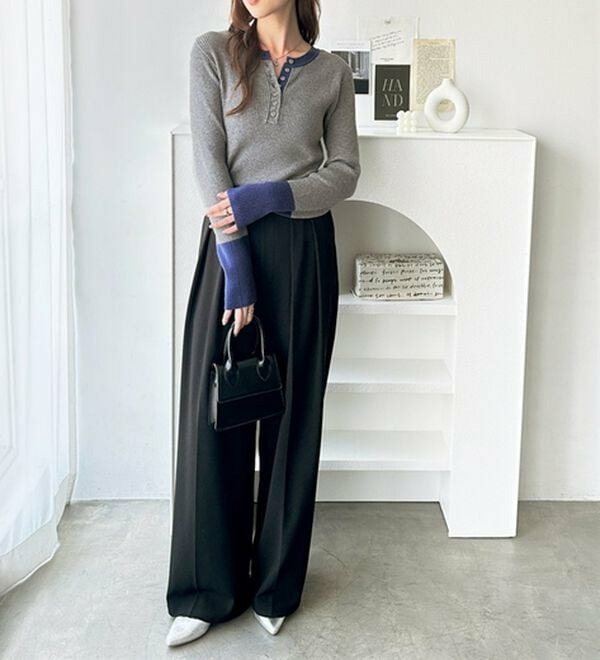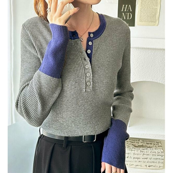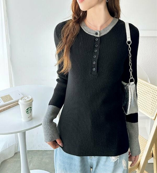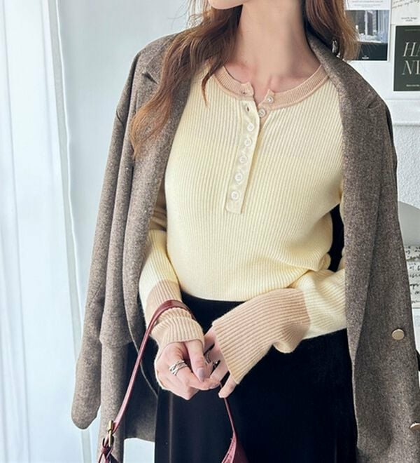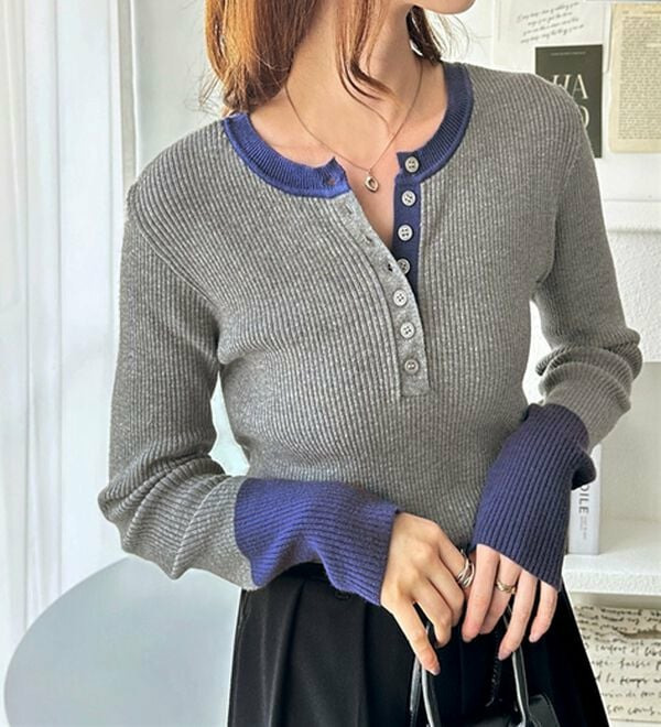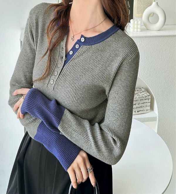 レイヤード見えする配色デザインで、こなれ感のあるヘンリーネックニット。