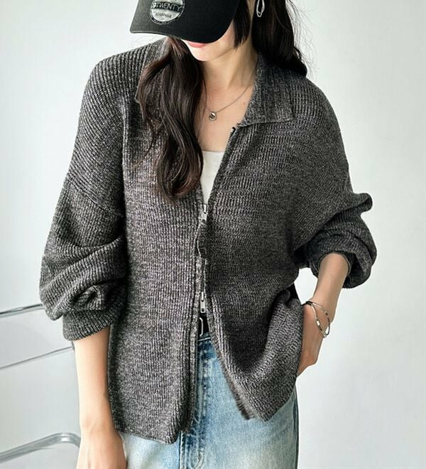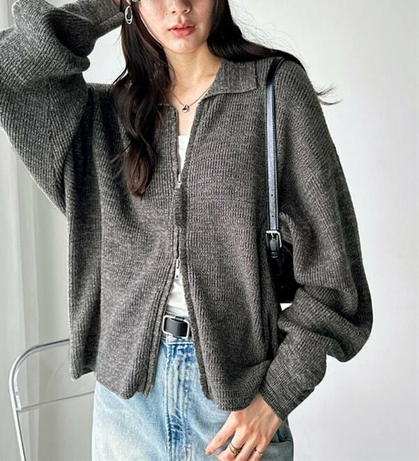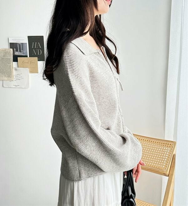 表面感のあるミックス素材が可愛い衿付きポロニットカーデ