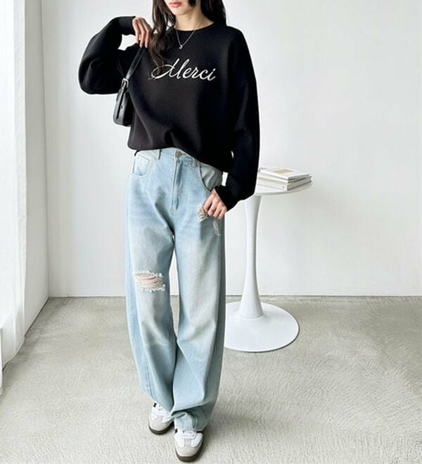 胸元の刺しゅうがアクセントになりつつも、シンプルでスタイリングしやすい活用度大の1着です。