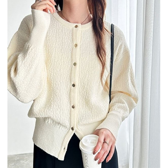 ぽこぽこと表面感のある素材とゴールドボタンが上品で華やかなカーディガン。
