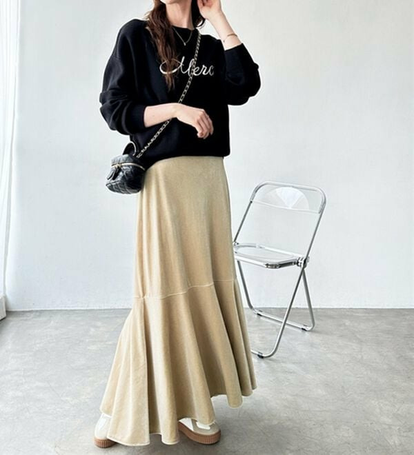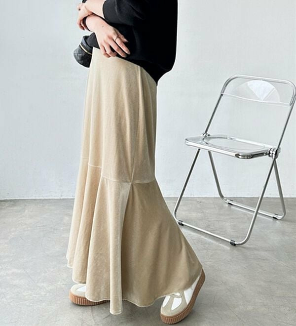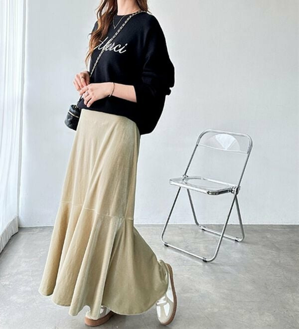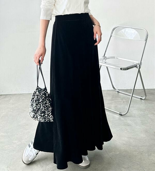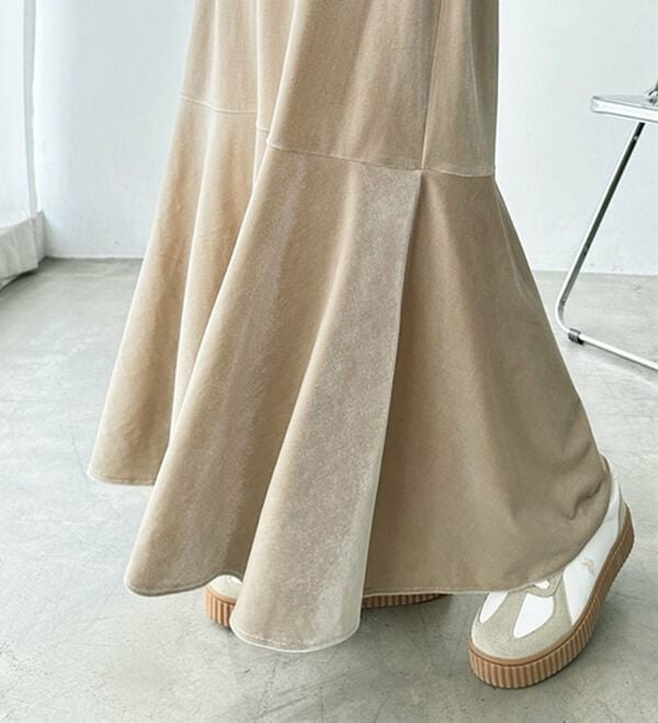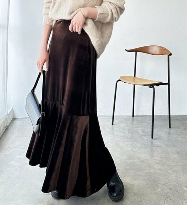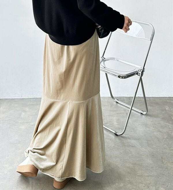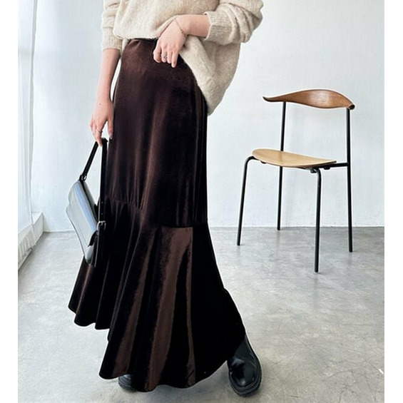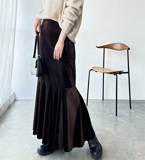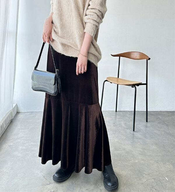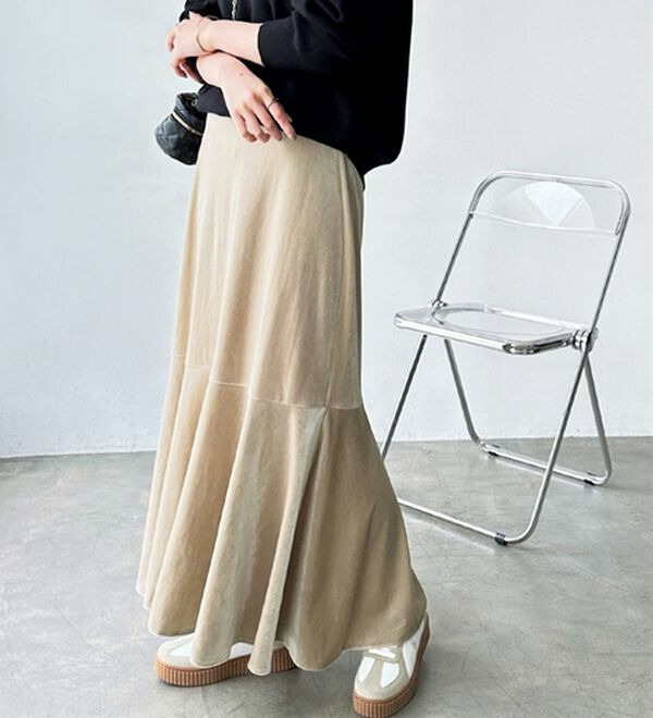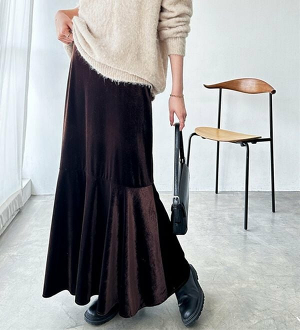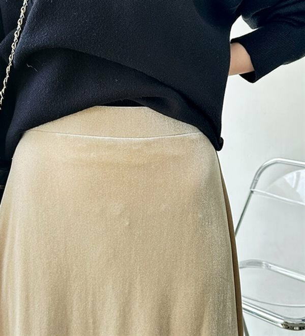 高見えする光沢感と柔らかな手触りが魅力のベロアスカート。
