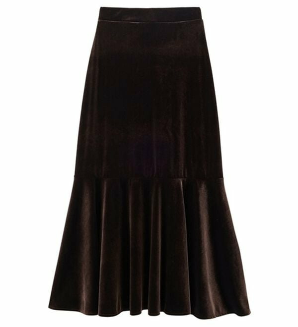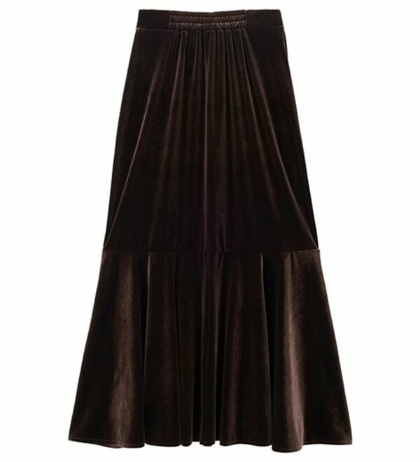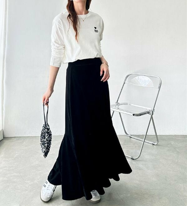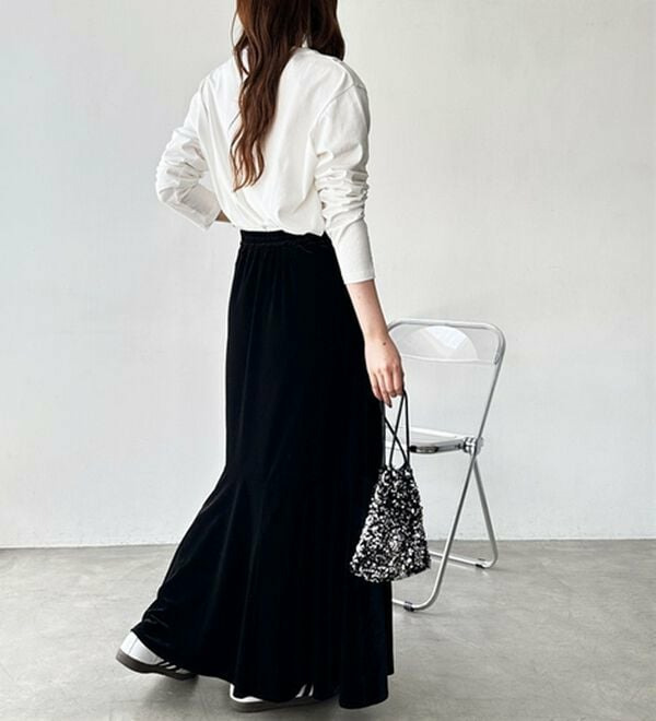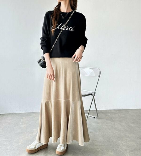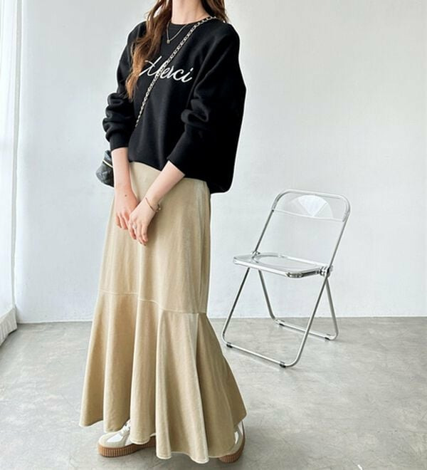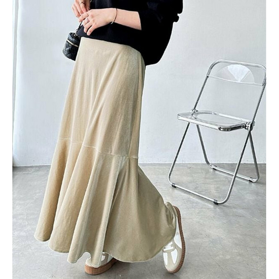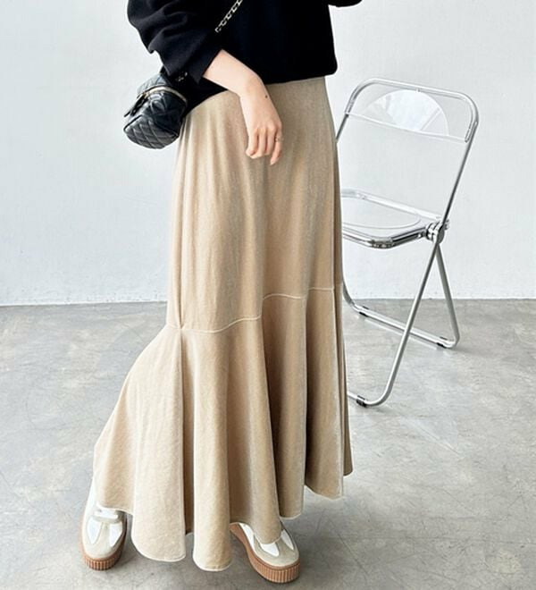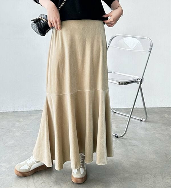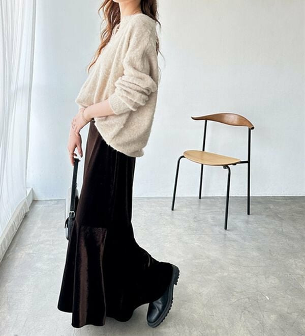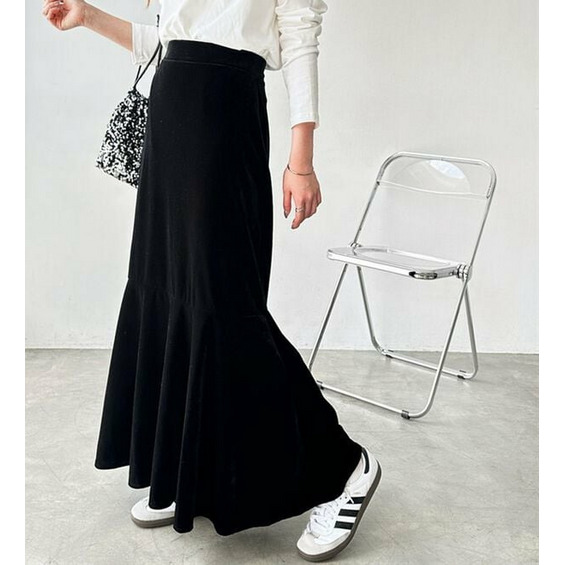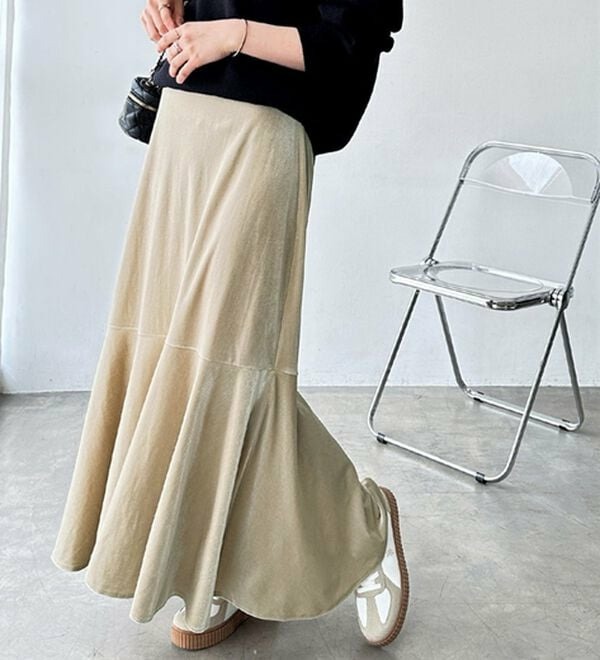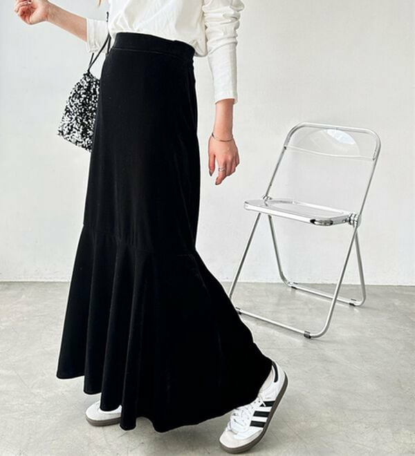 高見えする光沢感と柔らかな手触りが魅力のベロアスカート。