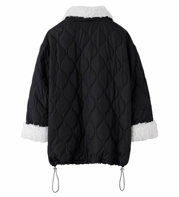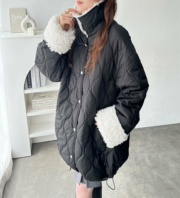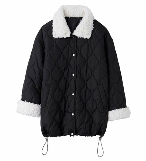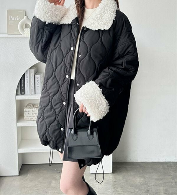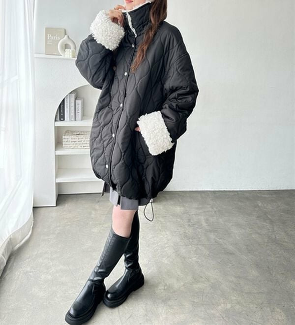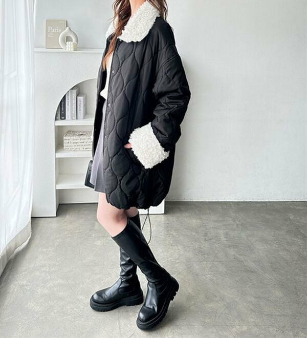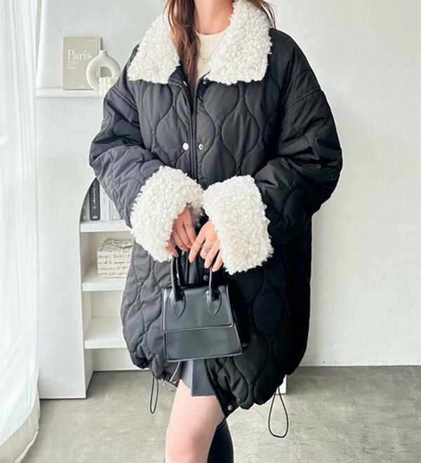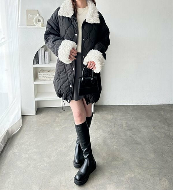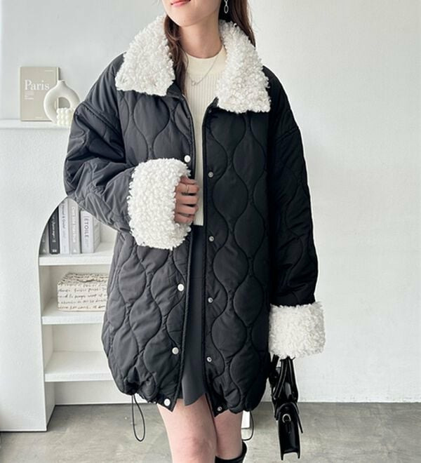 衿&袖口の配色ボアデザインが今年らしい印象をプラスするキルティングコート。