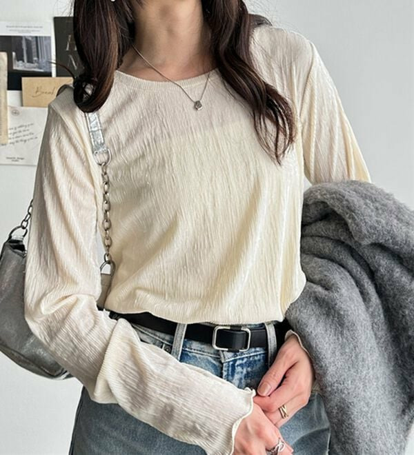 シンプルなデザインながら、ベロアプリーツ素材が目を引くカットソー。