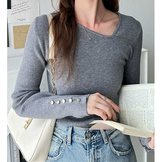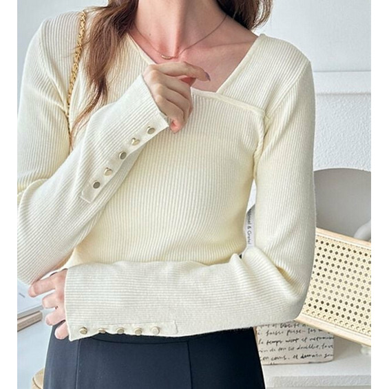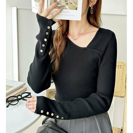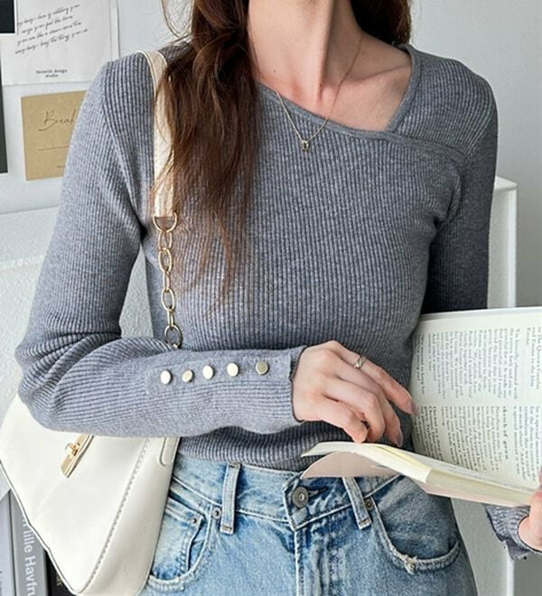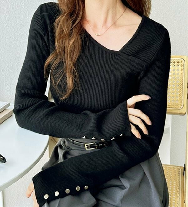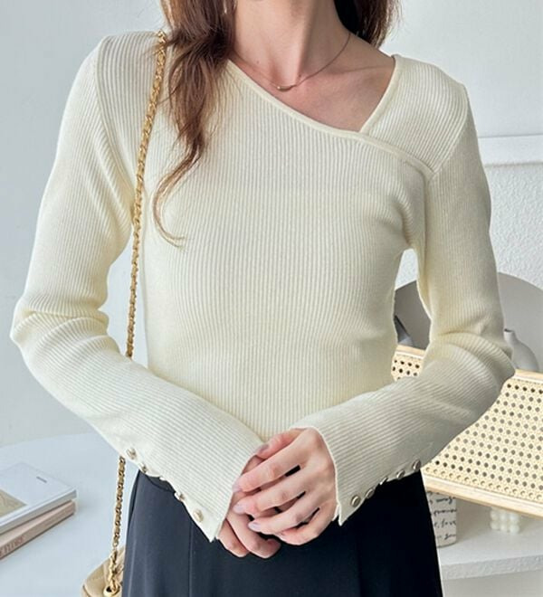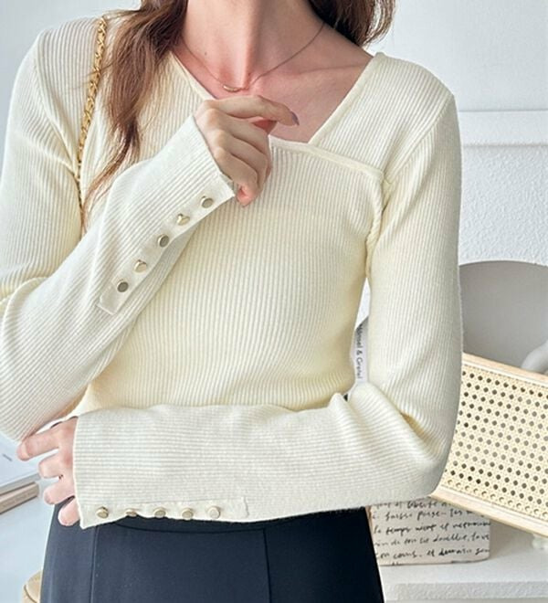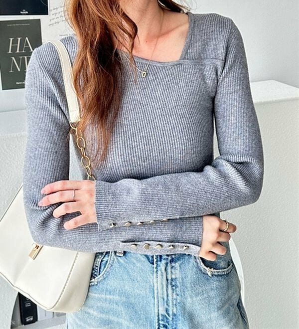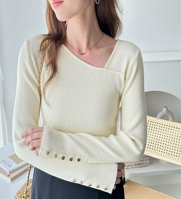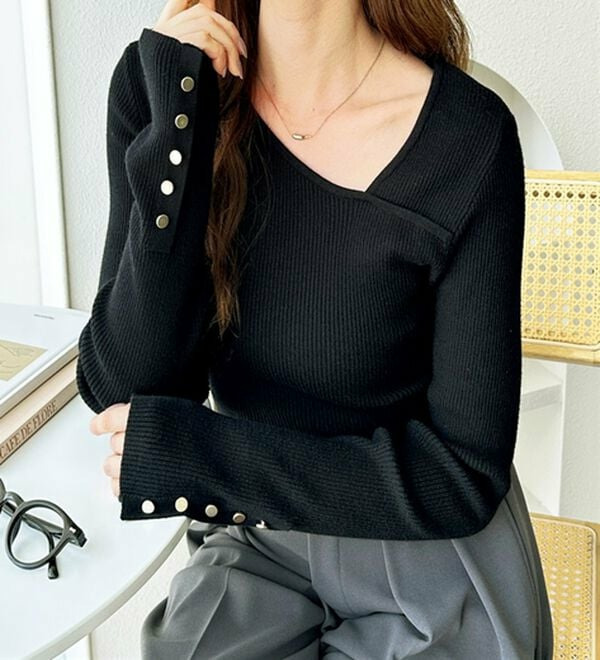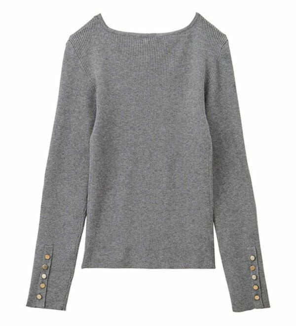 袖口のゴールドボタンが大人かわいさを引き立てるリブニット