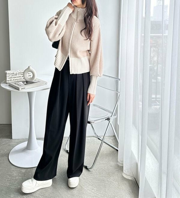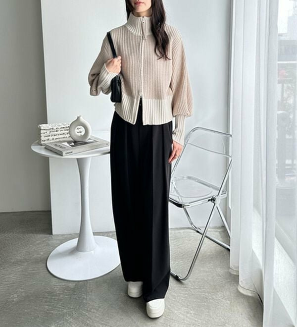 ダブルジップは下側だけ少し開けて、裾スリットのように着ると今年らしい印象に。