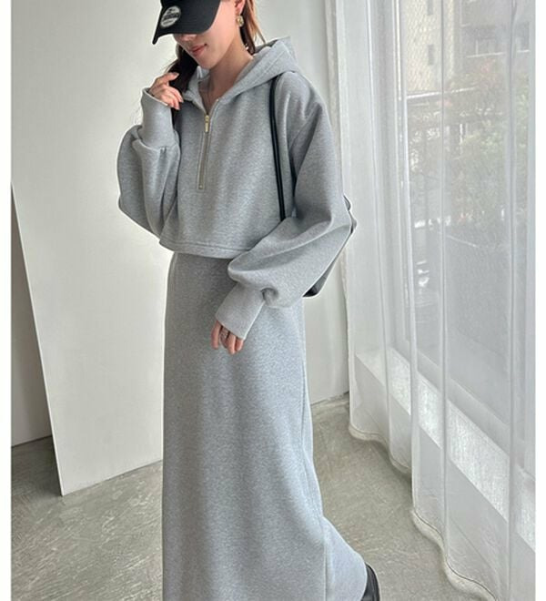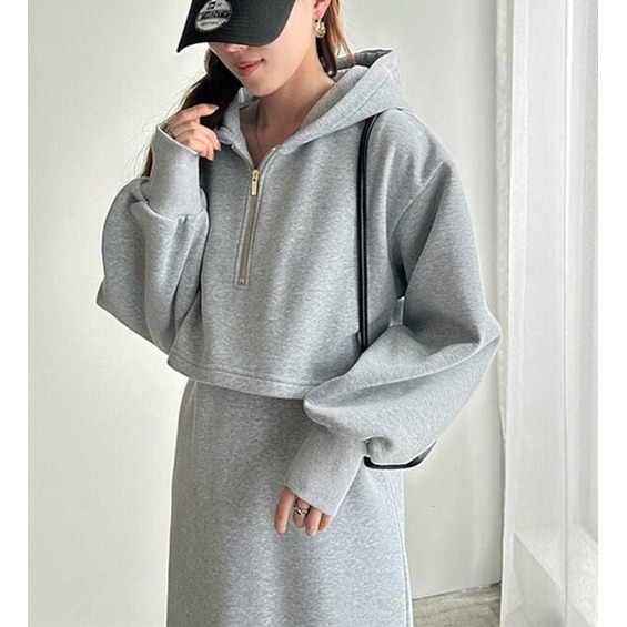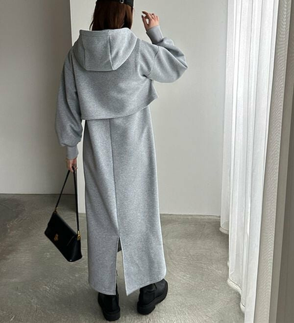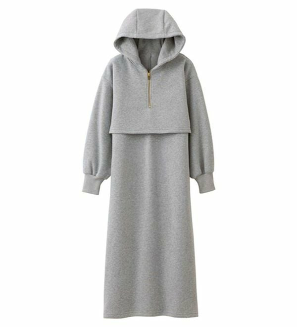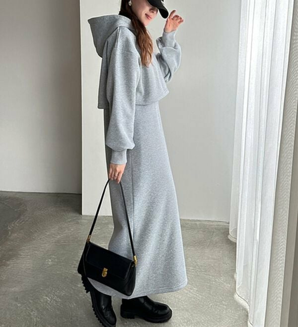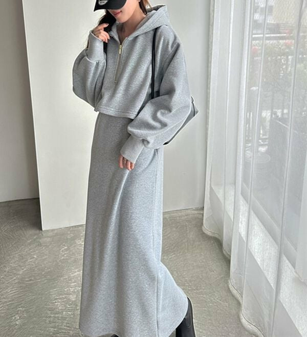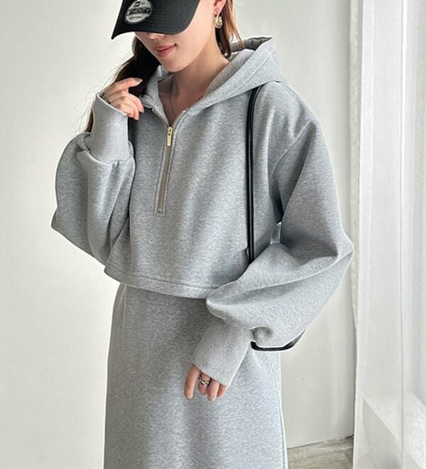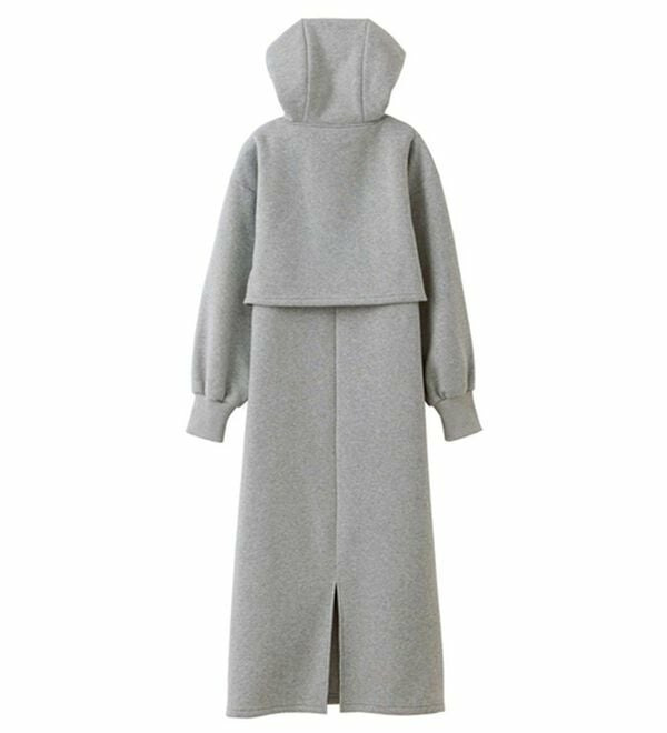 ショート丈パーカーとIラインワンピースがドッキングしたスウェットワンピース。