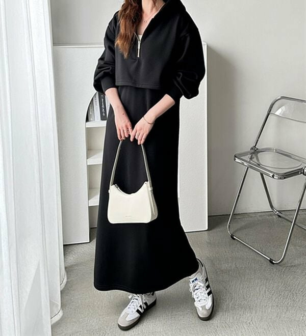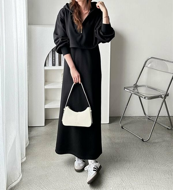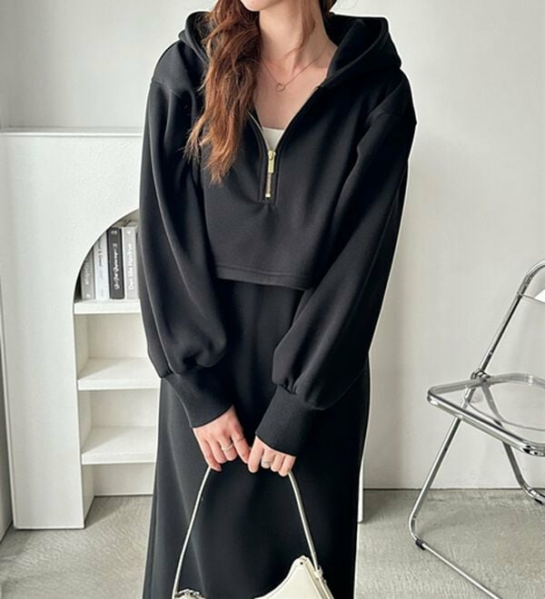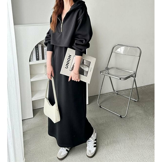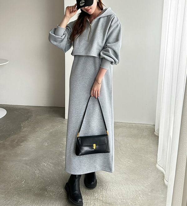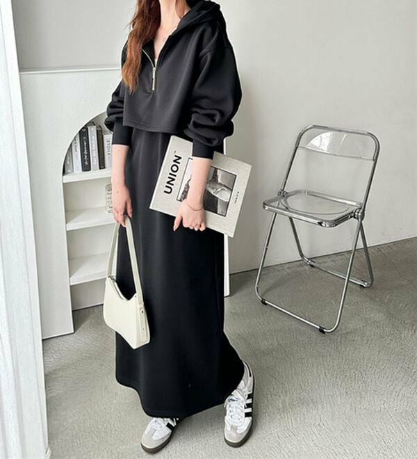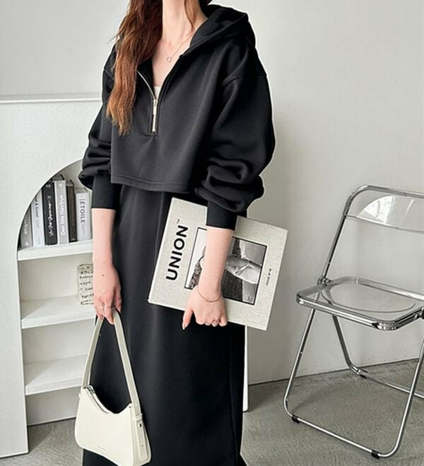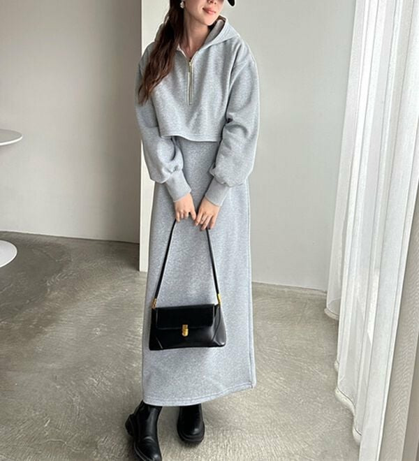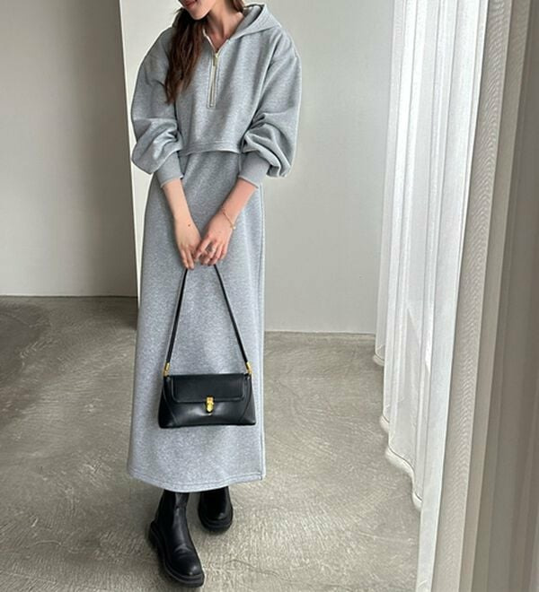 ショート丈パーカーとIラインワンピースがドッキングしたスウェットワンピース。