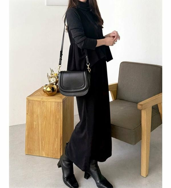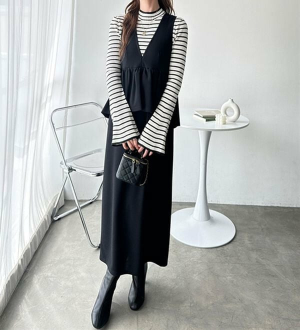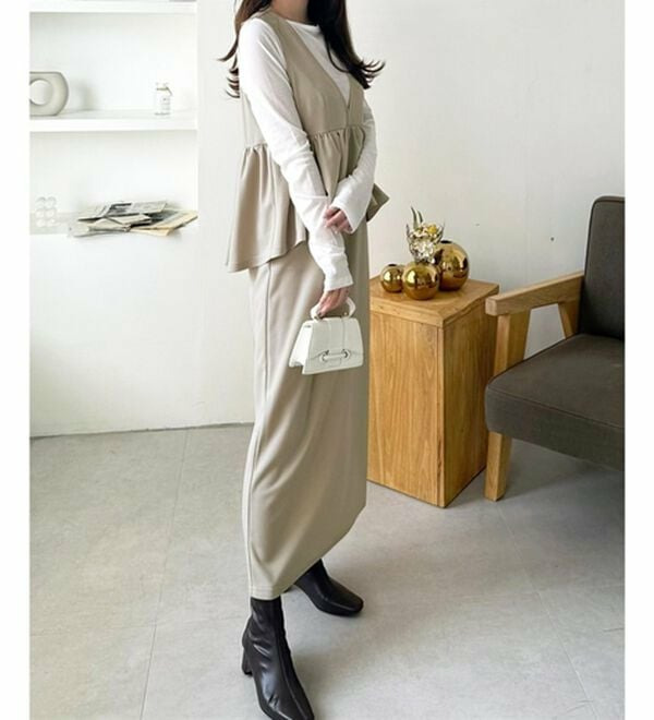 Iラインシルエットと高めのウエスト切替位置でスタイルアップも!
