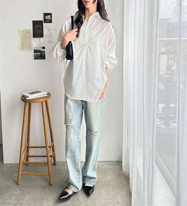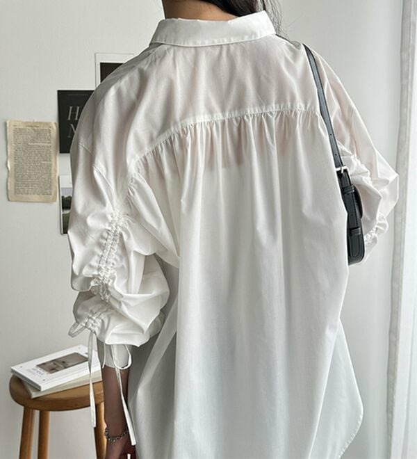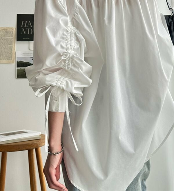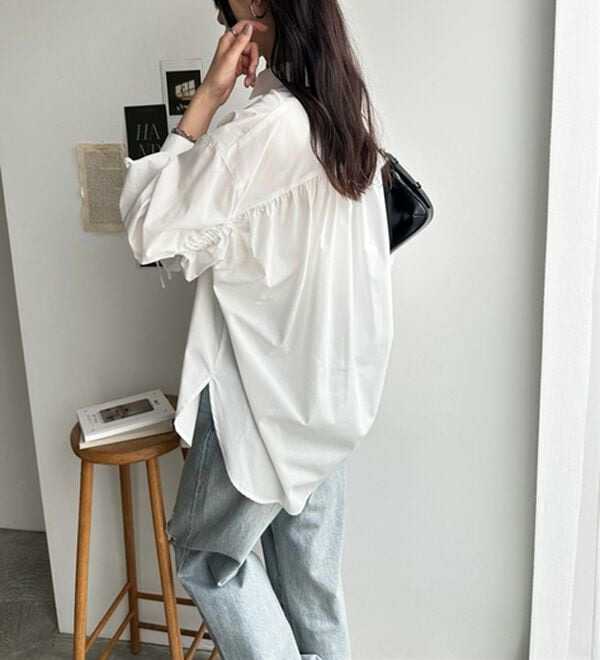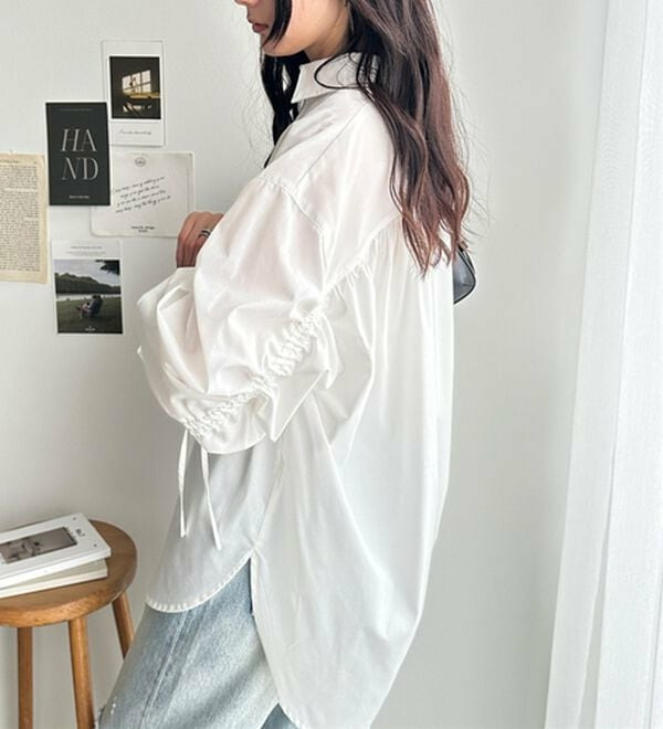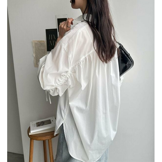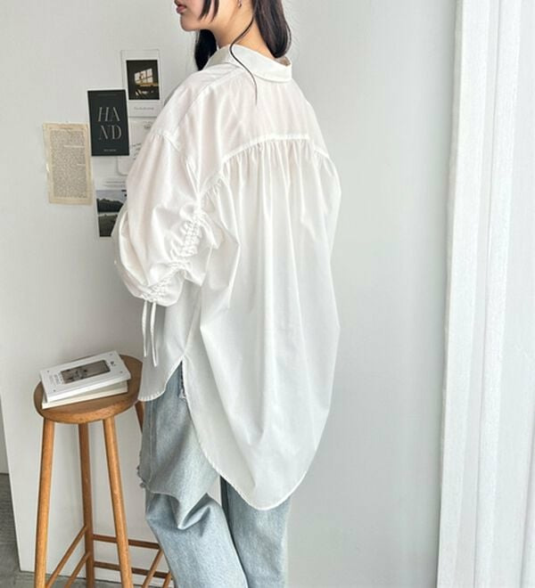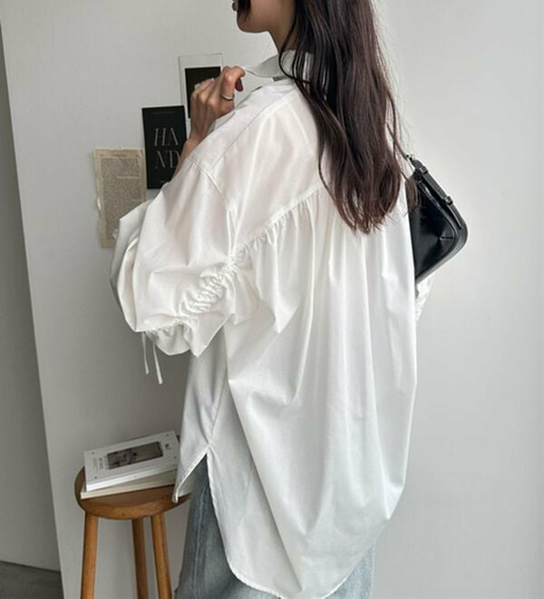 袖とバックのギャザーが目を惹くオーバーサイズシャツ