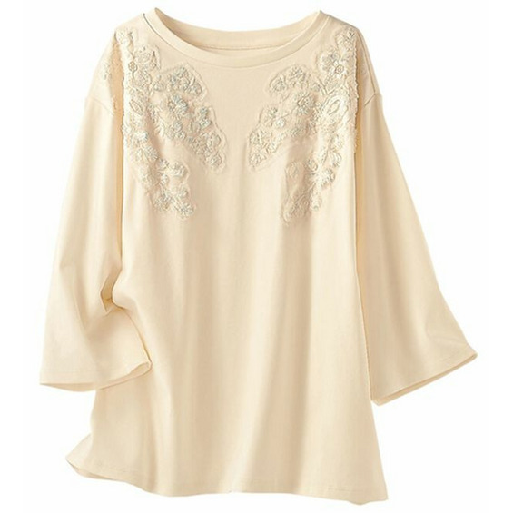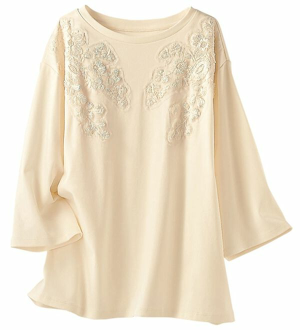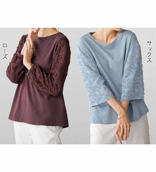 | 素材 | ■ 品質/(本体)綿100% (ローズ:レース部)ポリエステル100% (サックス:ジャカード部)ポリエステル100% (オフ白:レース部)ポリエステル100% (ミント:レース部)(基布)ナイロン100% (刺繍糸)綿100% (裏地)付(サックス・ローズ袖部のみ) * ドロップショルダーデザインです。(ローズは除く) * 後涙開き仕様(ローズ・サックスのみ) |