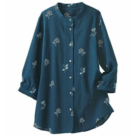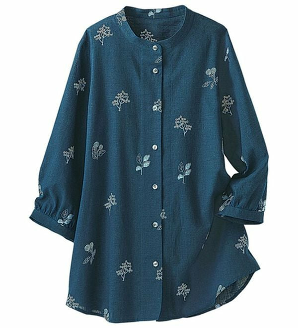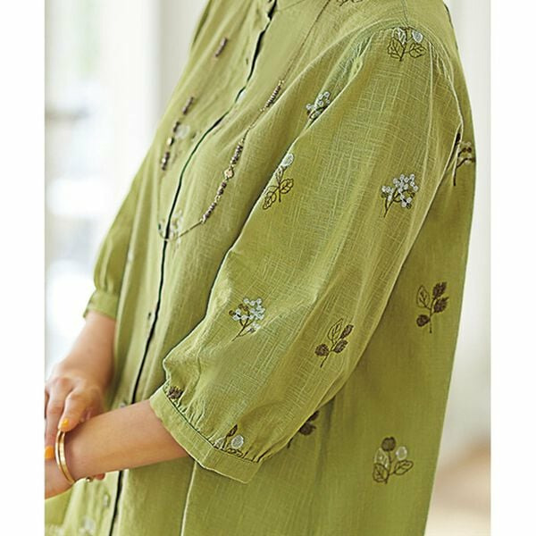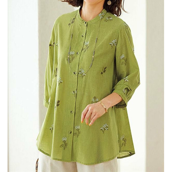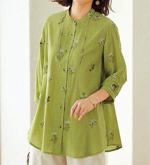 綿100%スラブ配色刺しゅうブラウス