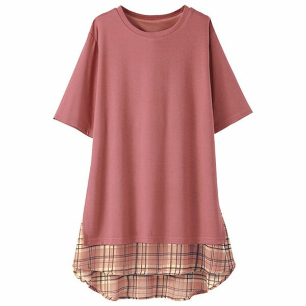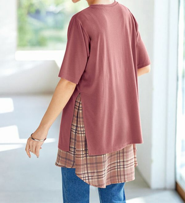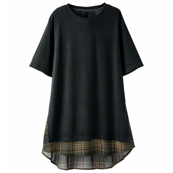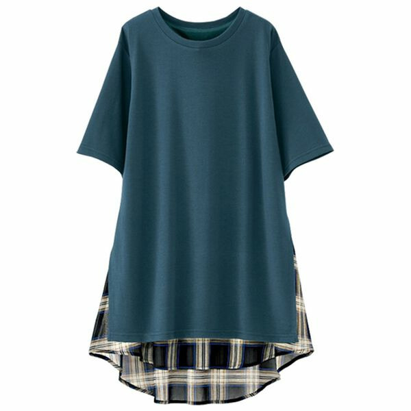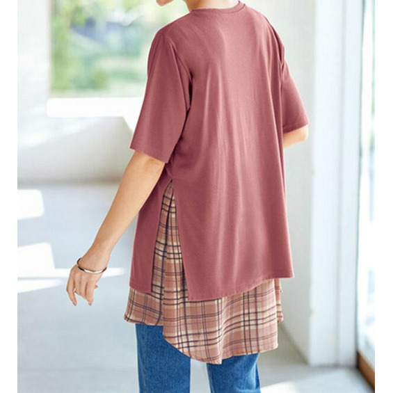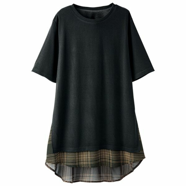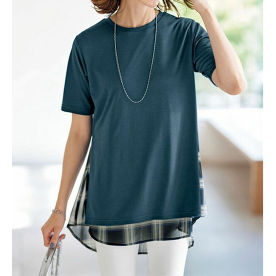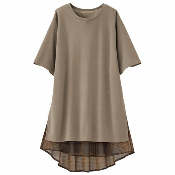 柔らかなカットソー素材と、透け感のあるチェック柄のシフォンをレイヤード風に切替えました。