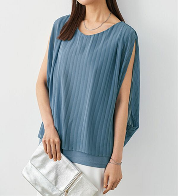 スリットのように開いた袖が腕をほっそり見せます。