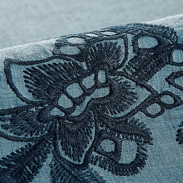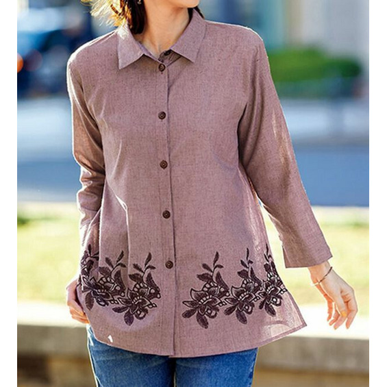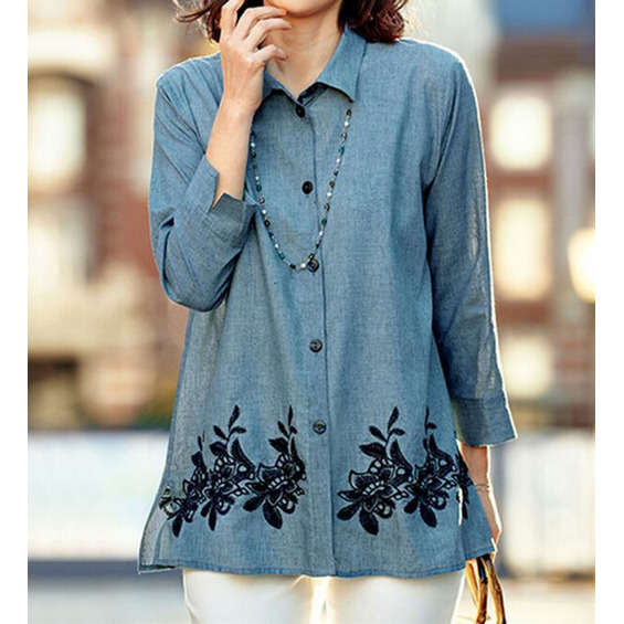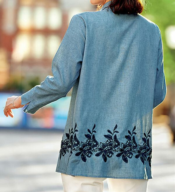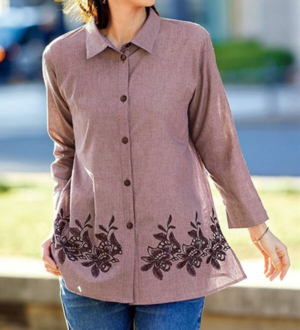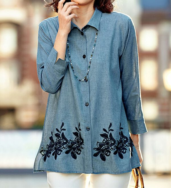 きちんと感のあるシャツ衿と印象的な花柄刺しゅうが夏の装いを格上げ。