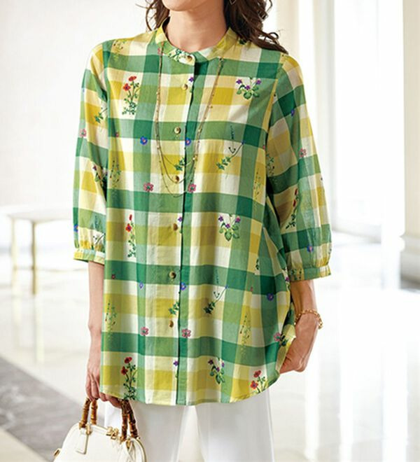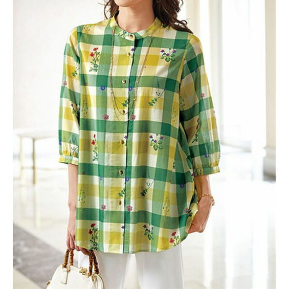 綿100%刺しゅう風チェックブラウス