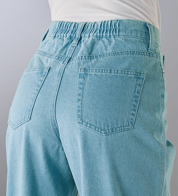 素材 ■ 品質/綿100% 裏地無 ポケット有 ウエスト後ゴム使い ファスナー前 * 製品洗い加工の特徴上、色・サイズに差異が生じる場合があります。 * 摩擦等により色移りすることがあります。