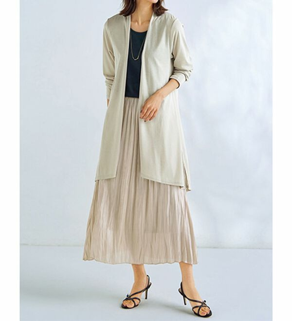 風に揺れるロング丈が体型をほっそり見せてスタイルアップ。
