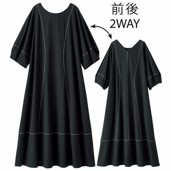 クルーネックとVネックの前後両方が楽しめて、ふんわりとしたランタンスリーブが二の腕をカバーしてくれます。