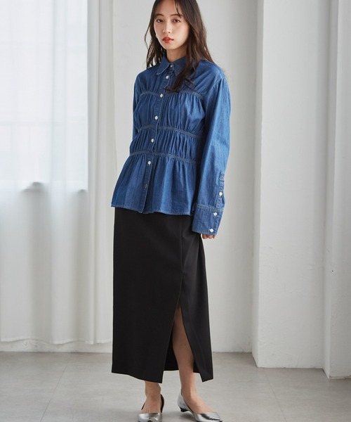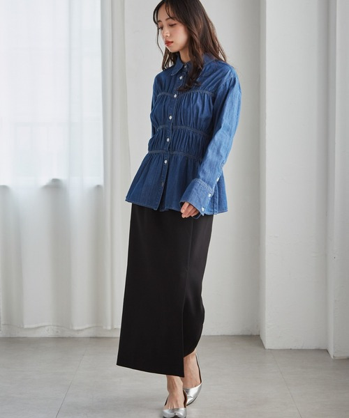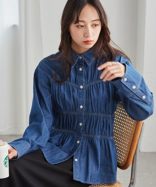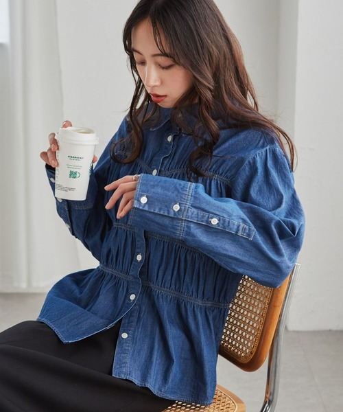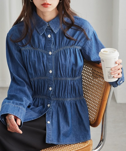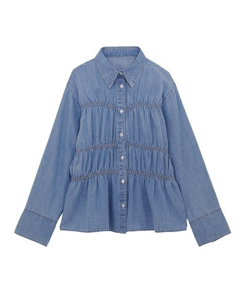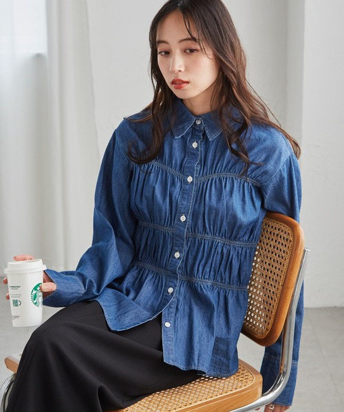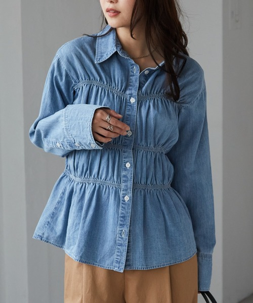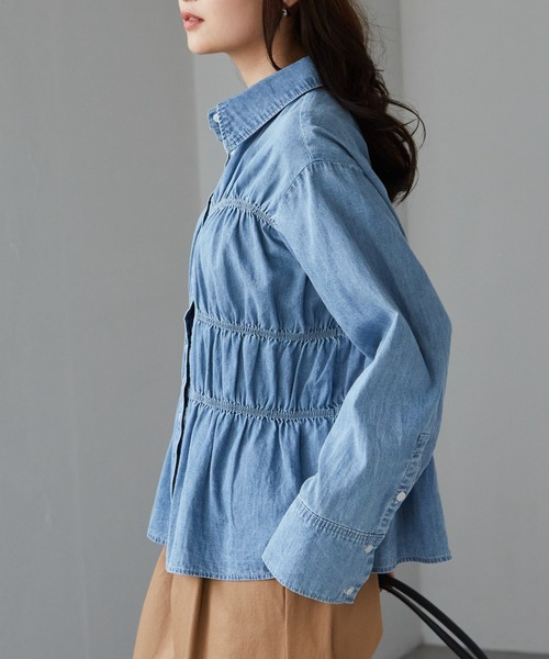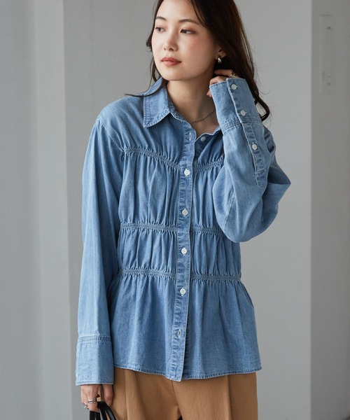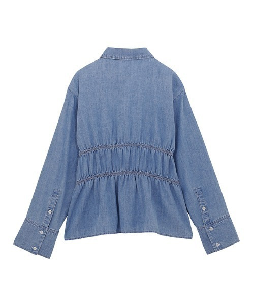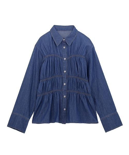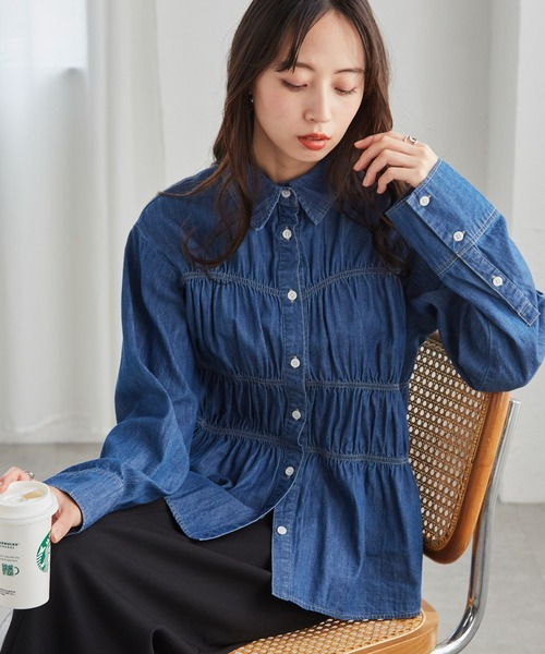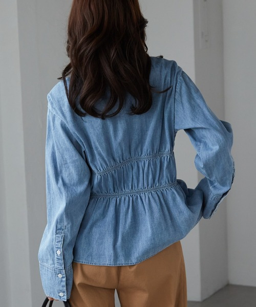 ビスチェ風のシャーリングを施したデニムデザインシャツ
