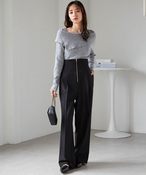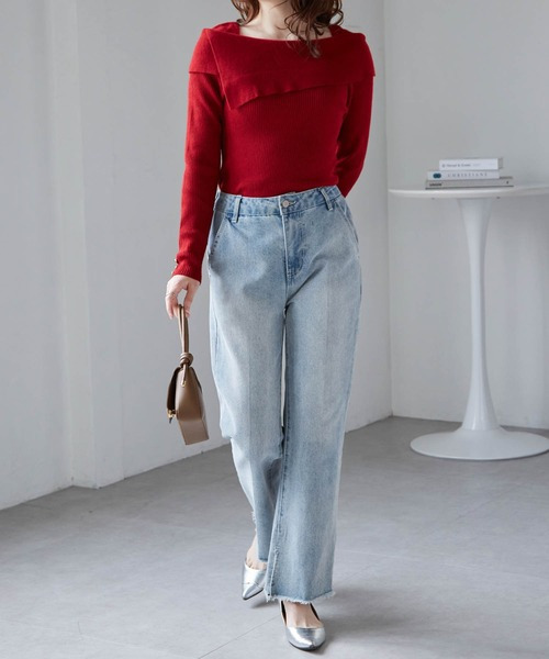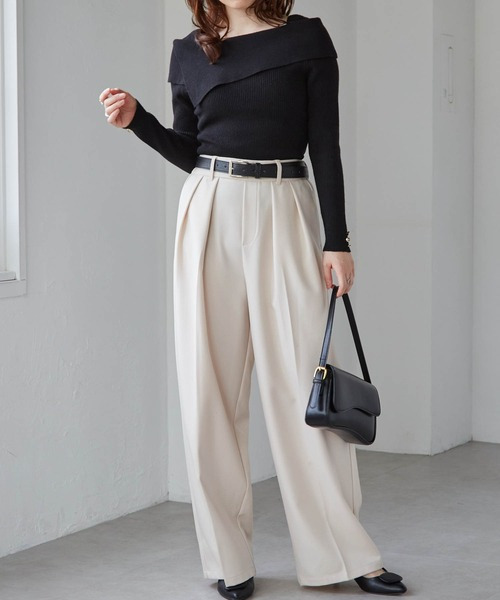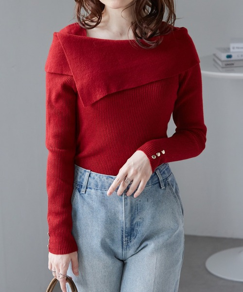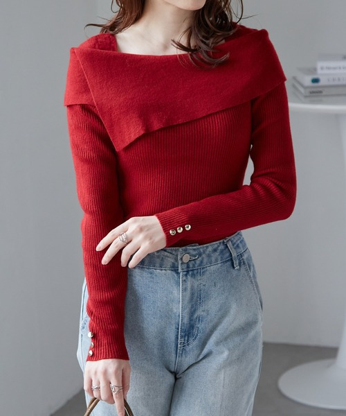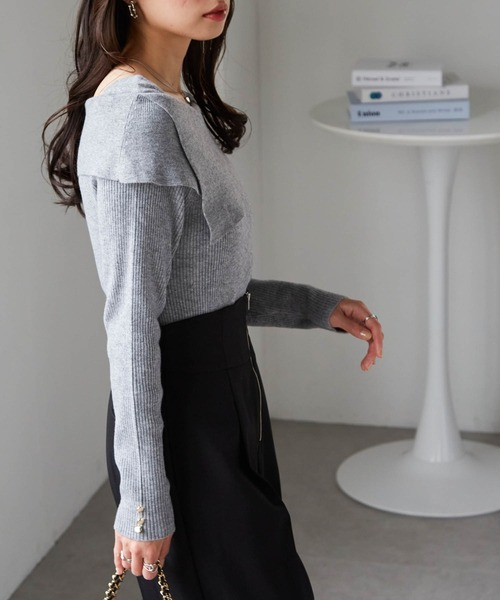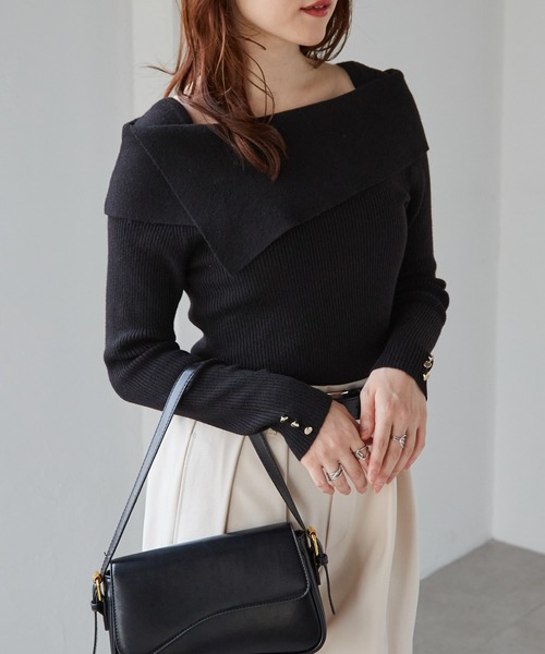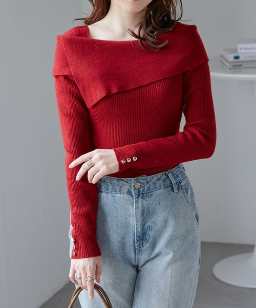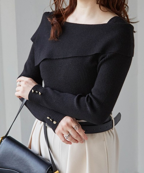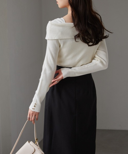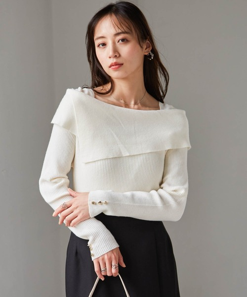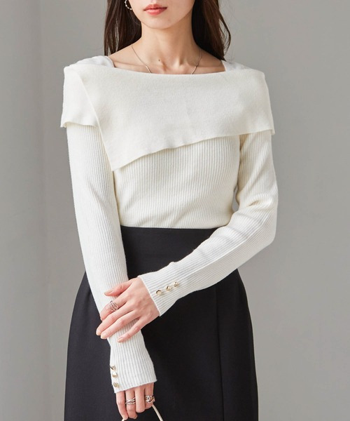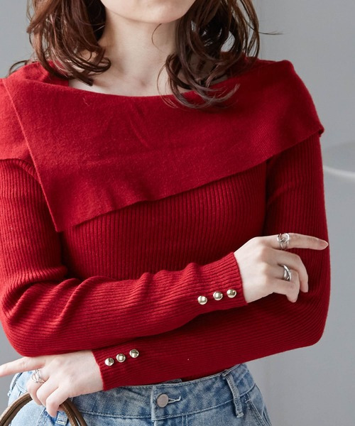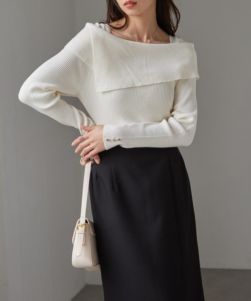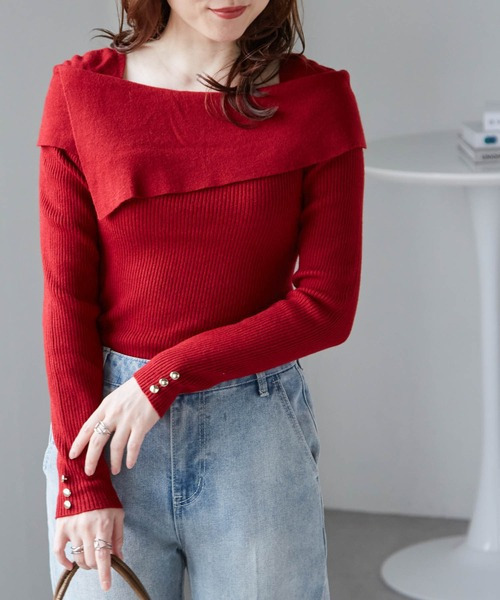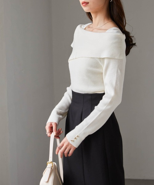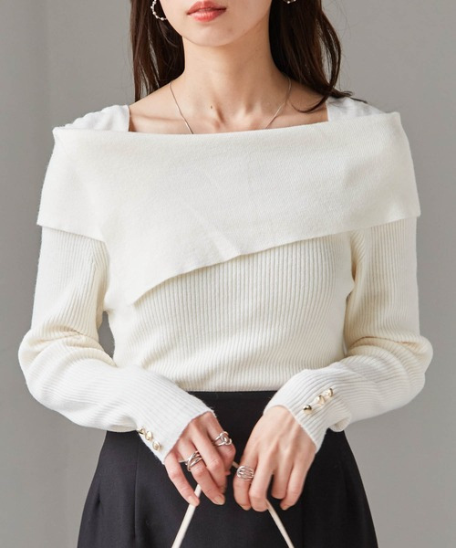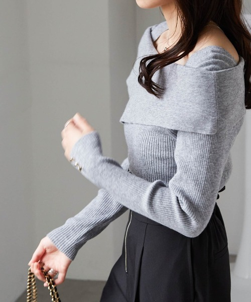 インナーに悩まず楽しめるオフショル風のニットトップス。