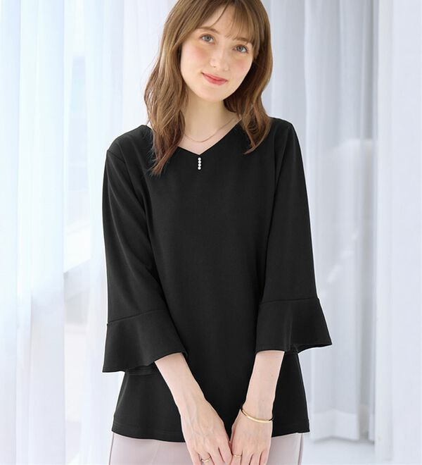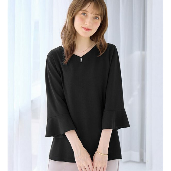 【接触冷感】パール調ボタンフレアー袖ブラウスTシャツ