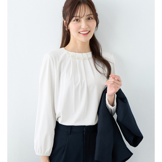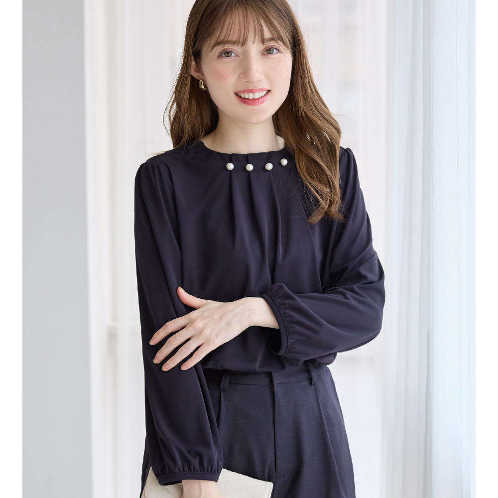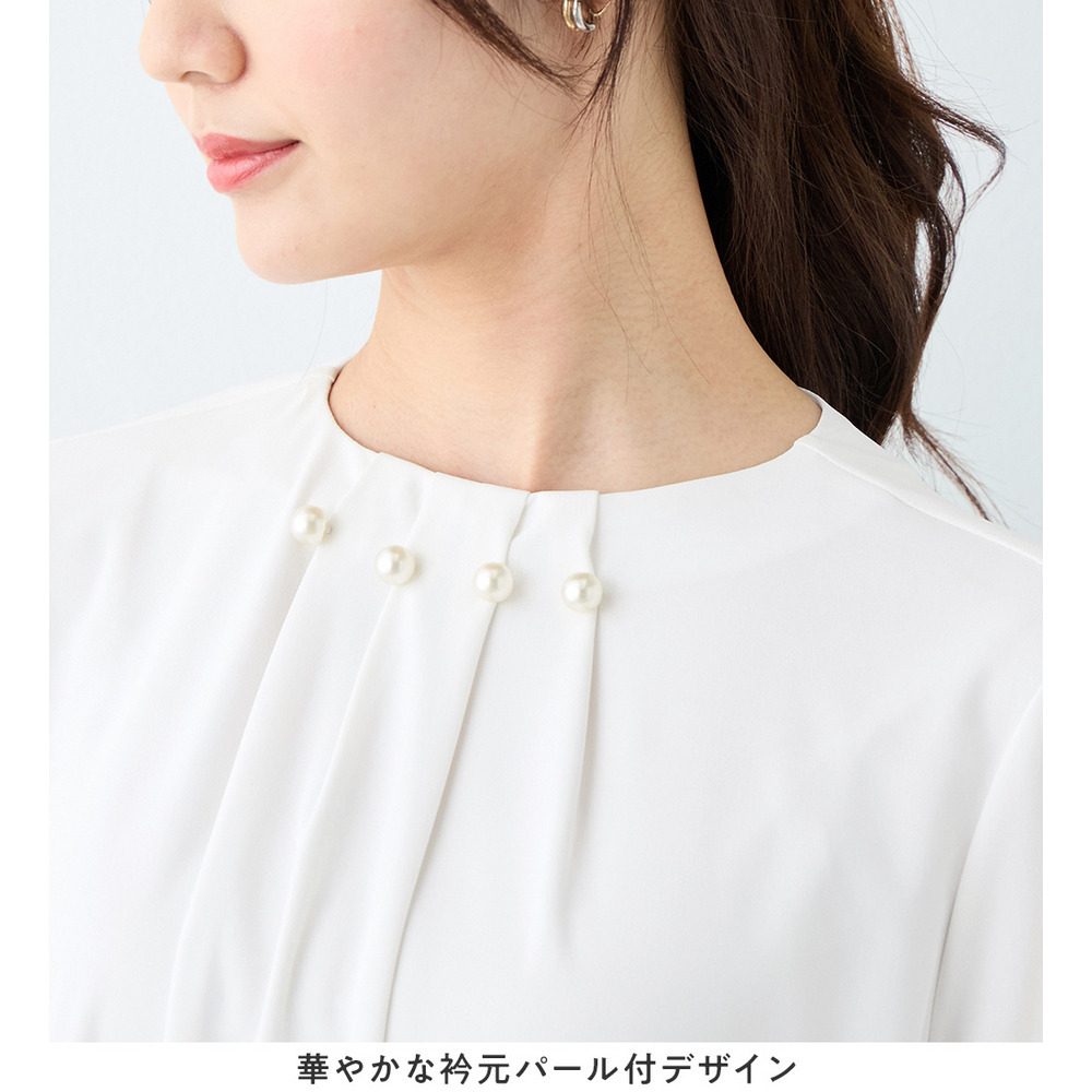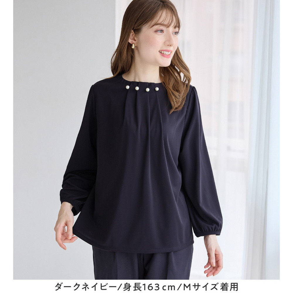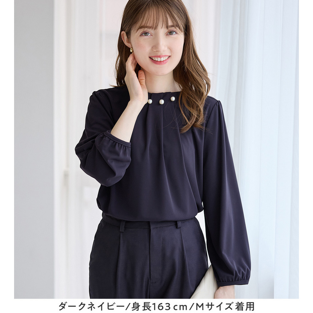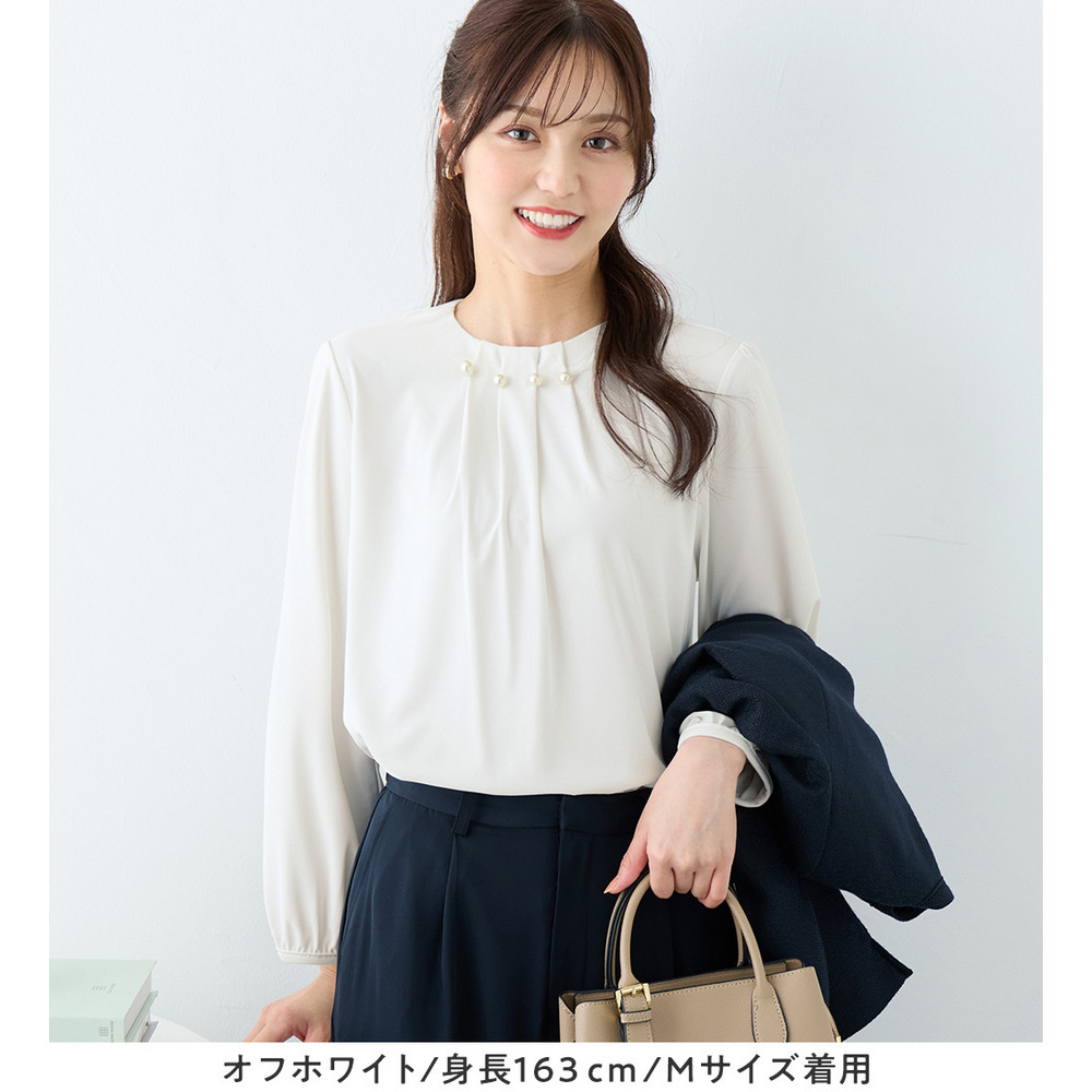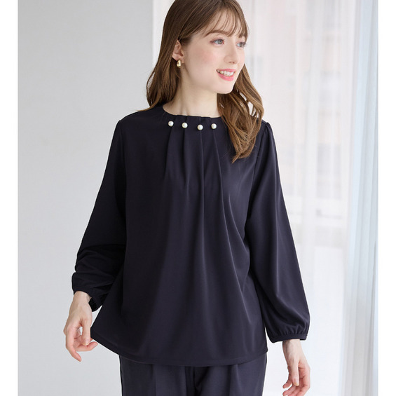 首元のパールビーズとタックデザインが、上品で華やかな印象を与えるブラウス。