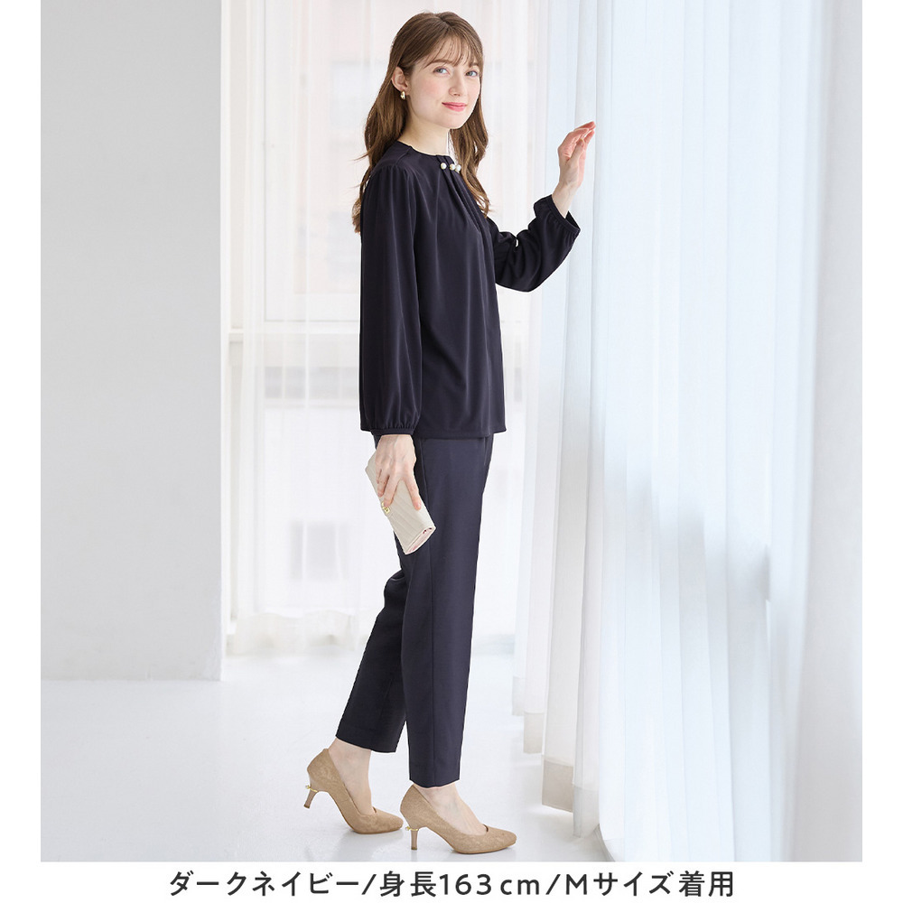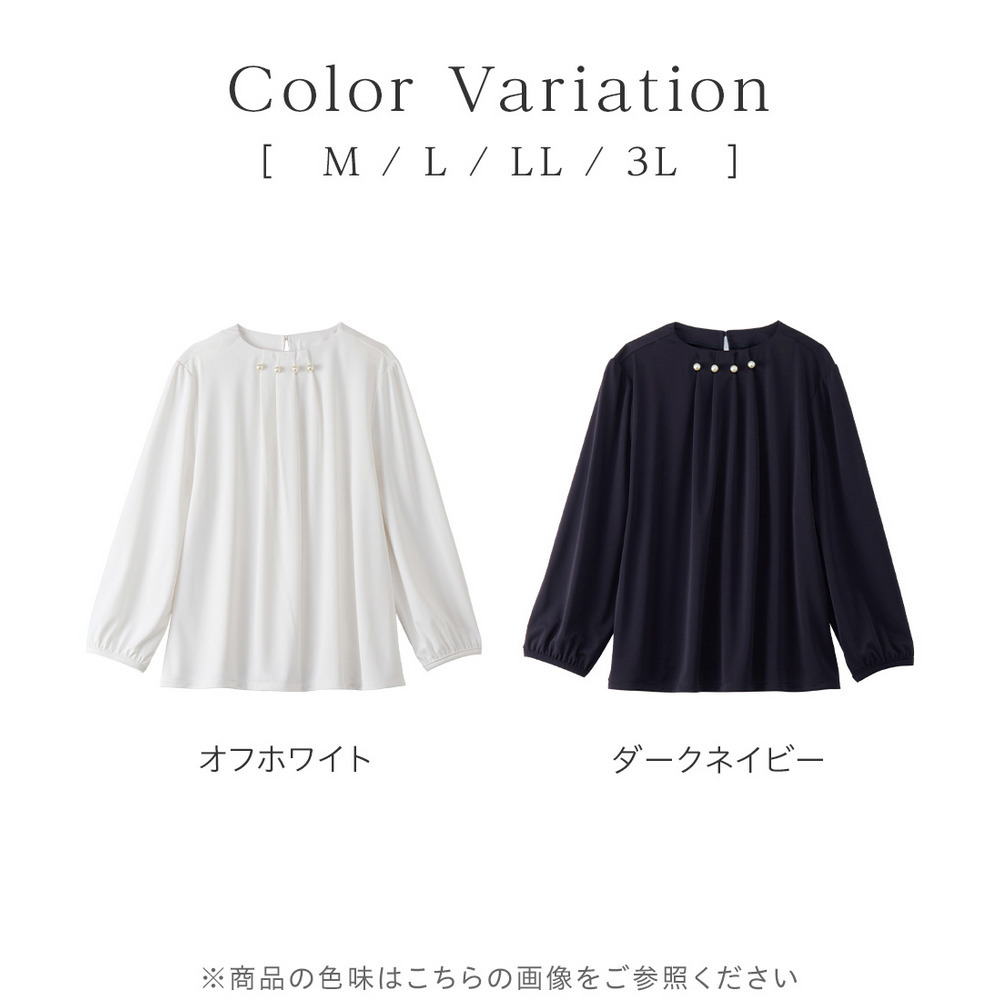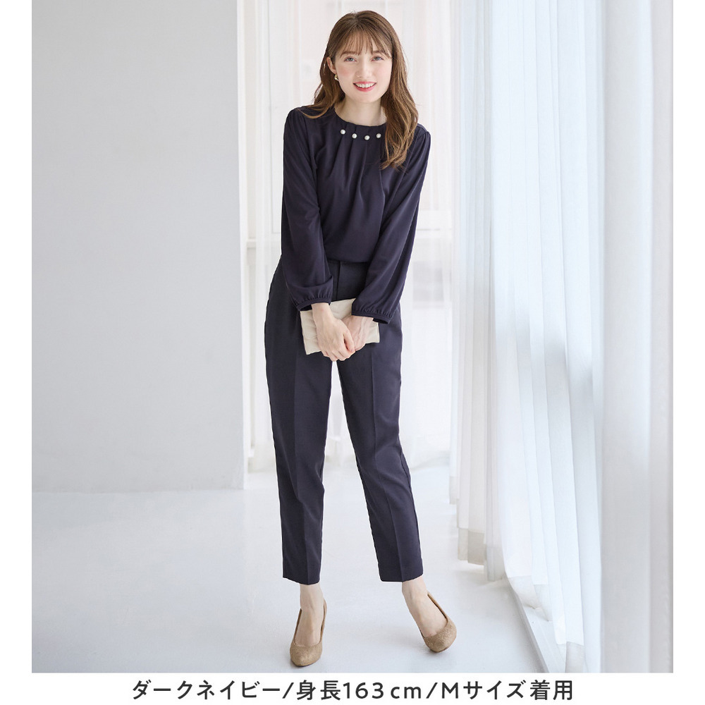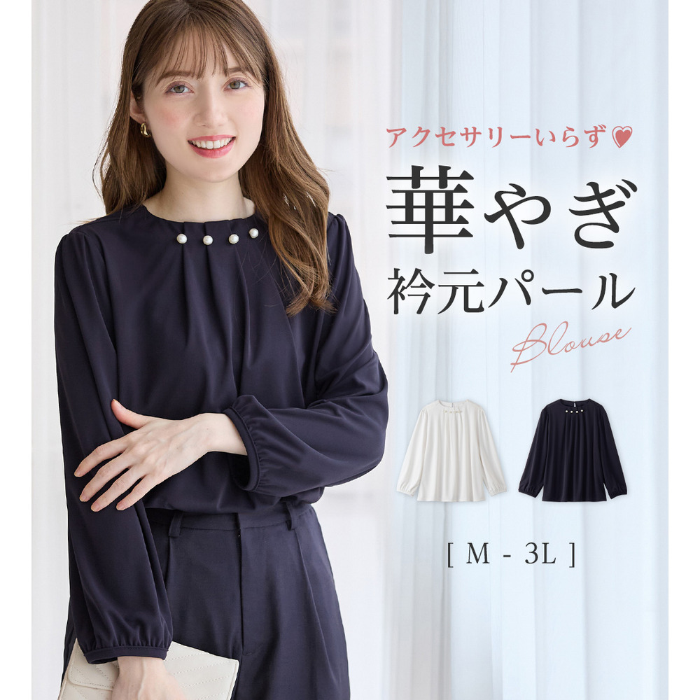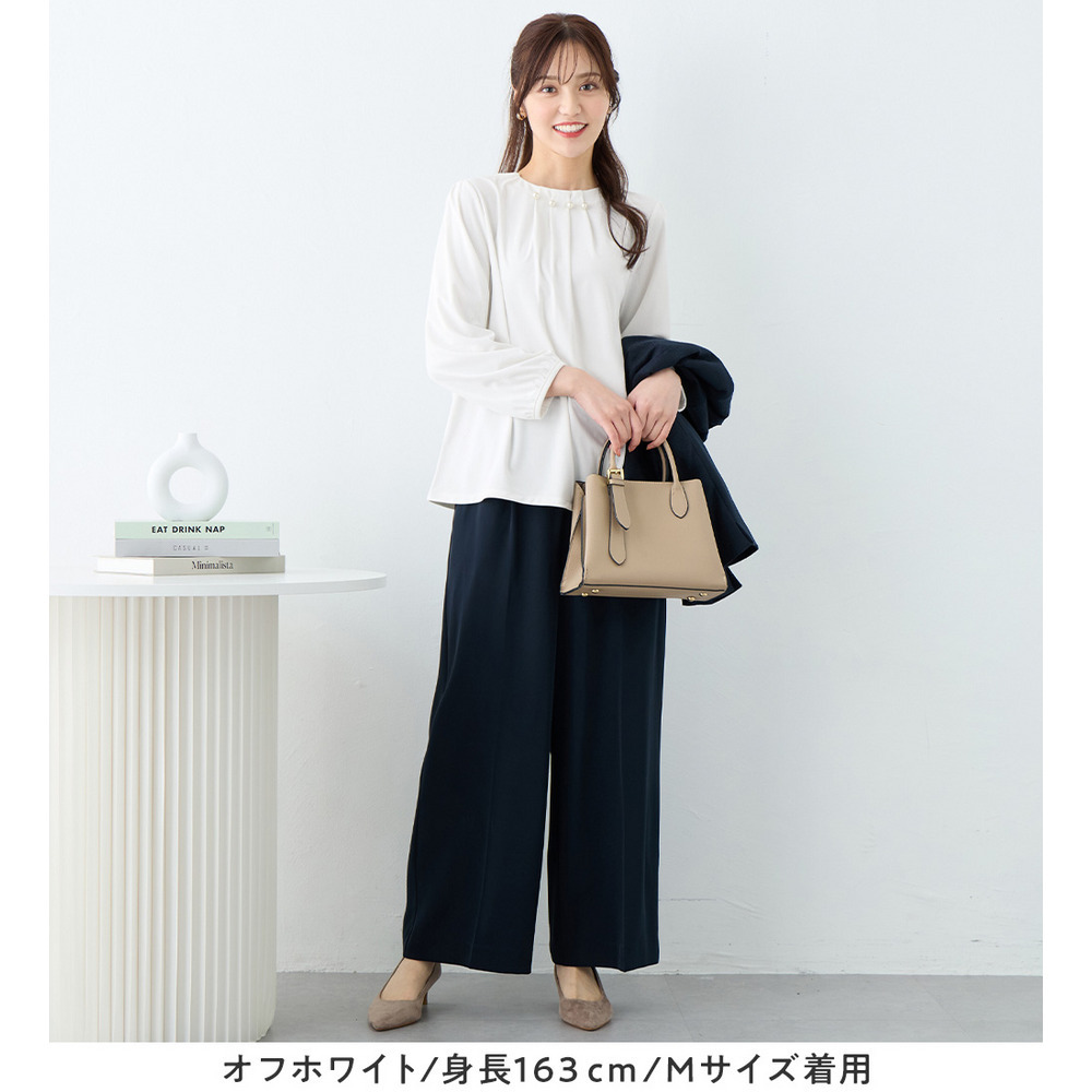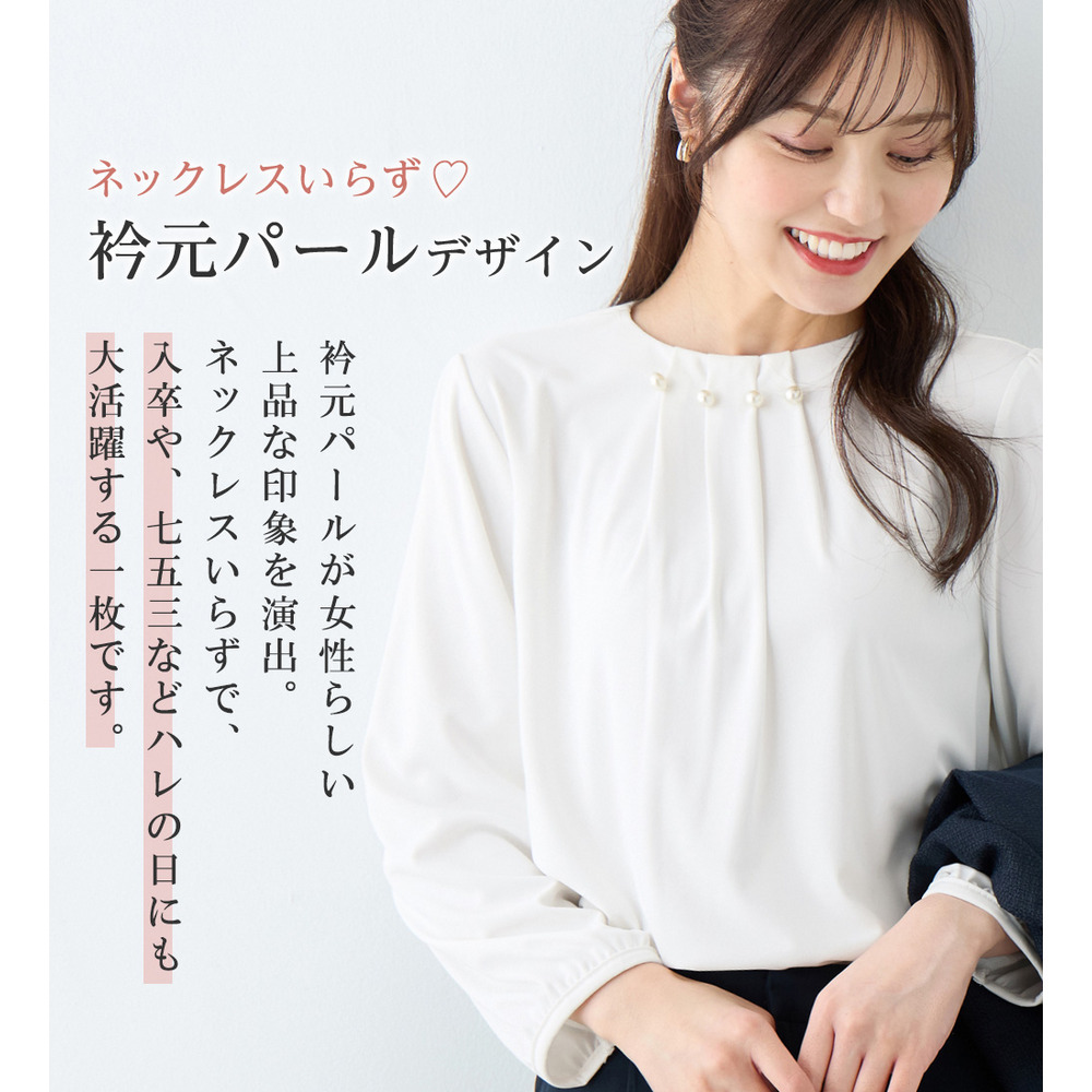 首元のパールビーズとタックデザインが、上品で華やかな印象を与えるブラウス。