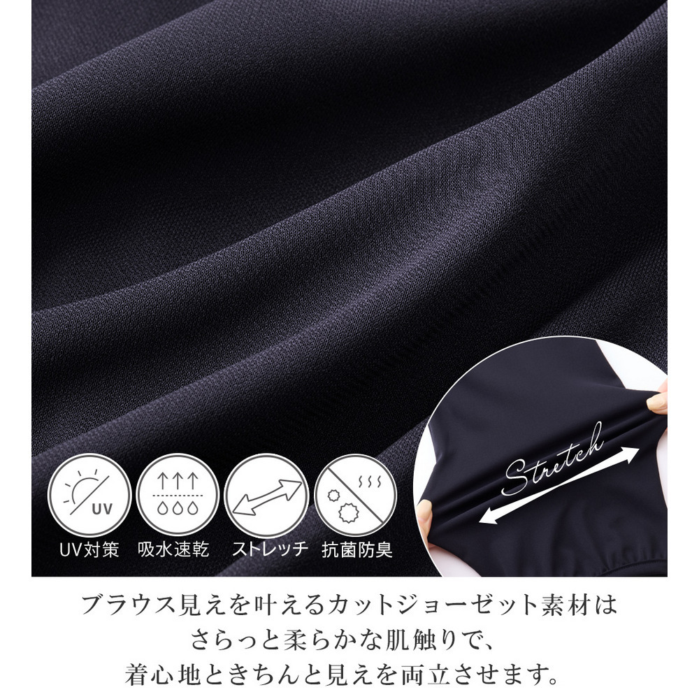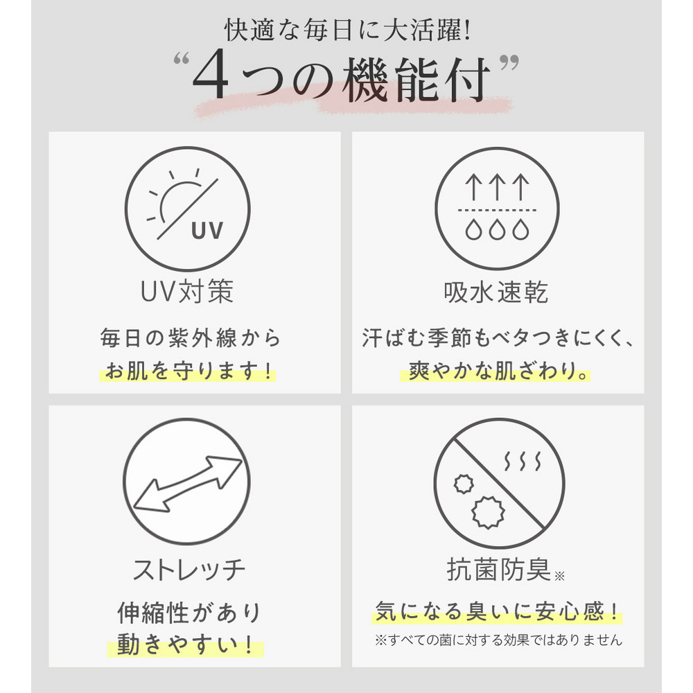 <UV対策>紫外線からお肌を守ります!<吸水速乾>汗ばむ季節もベタつきにくく、爽やかな肌ざわり。<ストレッチ>伸縮性があり動きやすい!<抗菌防臭>気になる臭いに安心感♪(※全ての菌に対する効果ではありません)※色味は物画像をご参照ください。※ご覧のモニター環境により画像の色味と多少異なる場合がございます。※撮影照明の関係により実際の色味と異なって見える場合がございます。予め、ご了承ください。