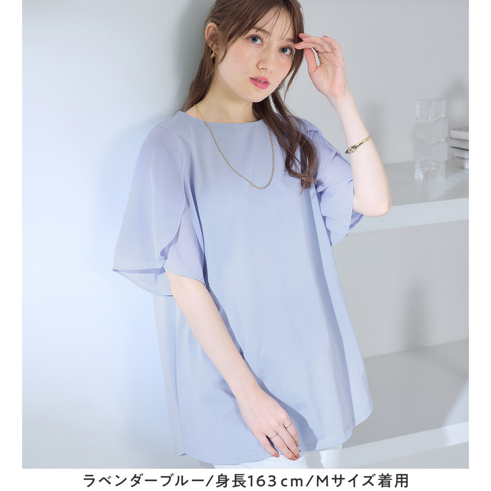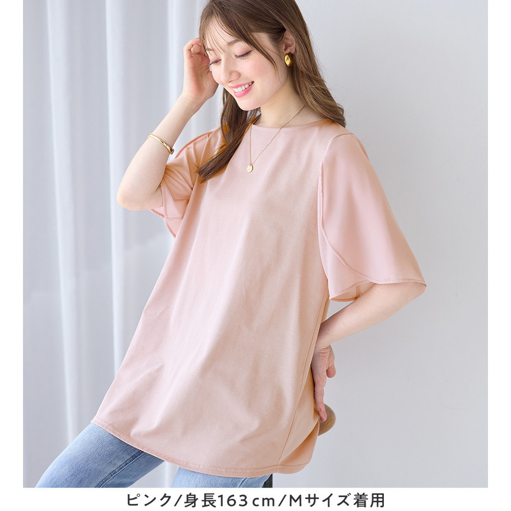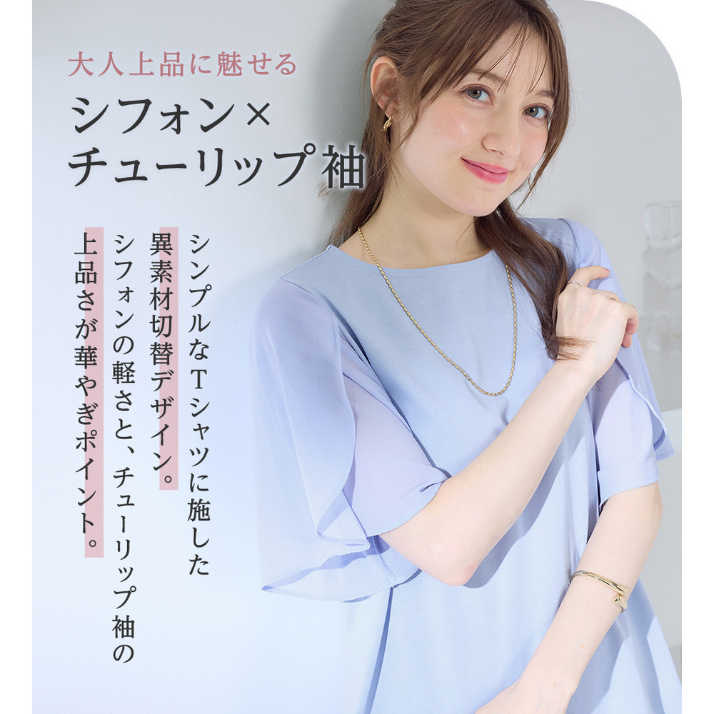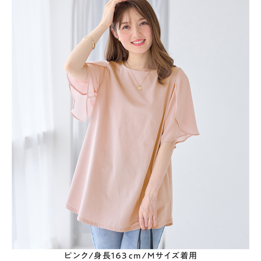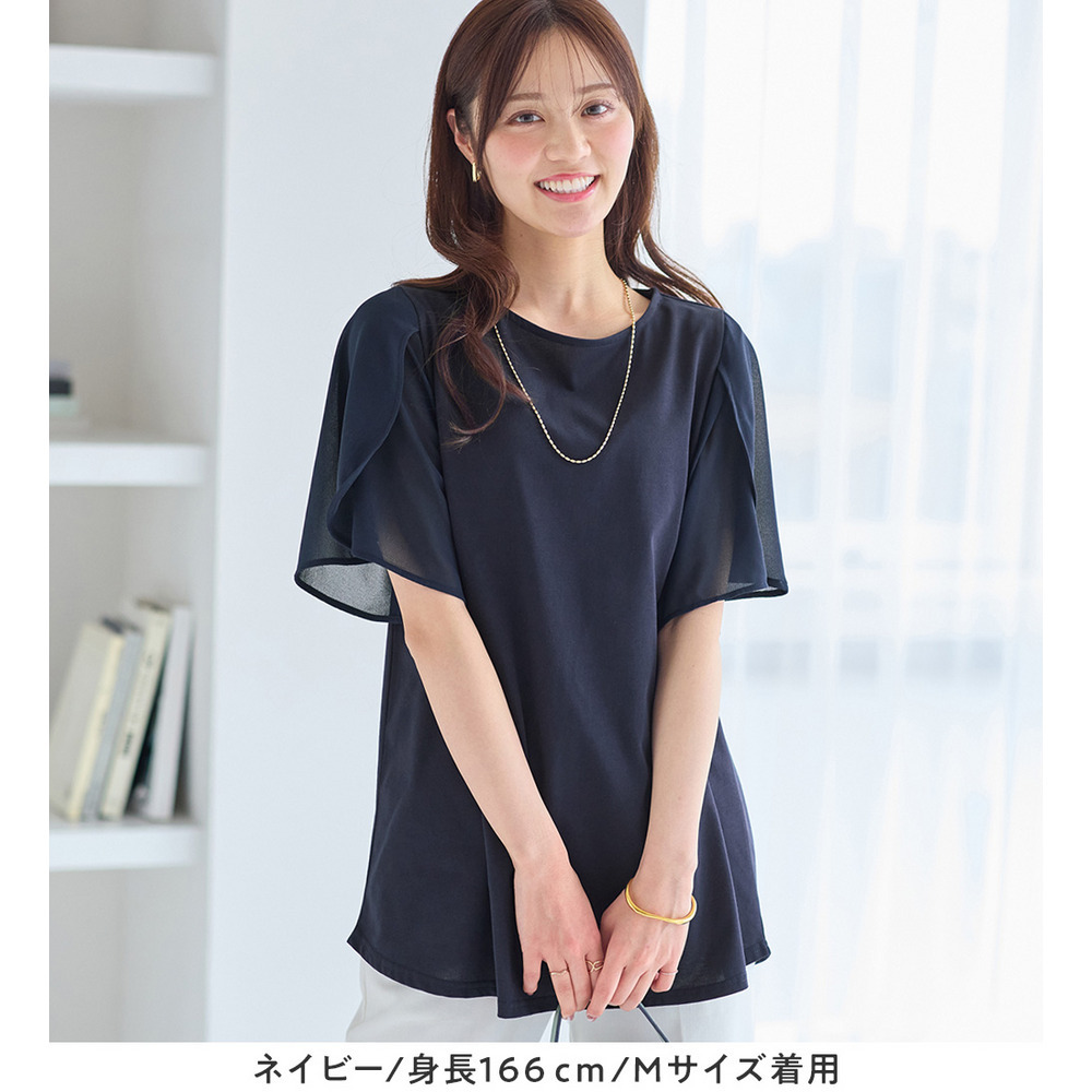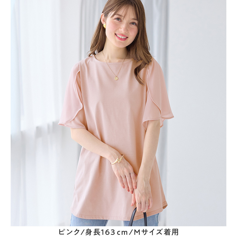 シフォン切替チューリップ袖チュニックTシャツ