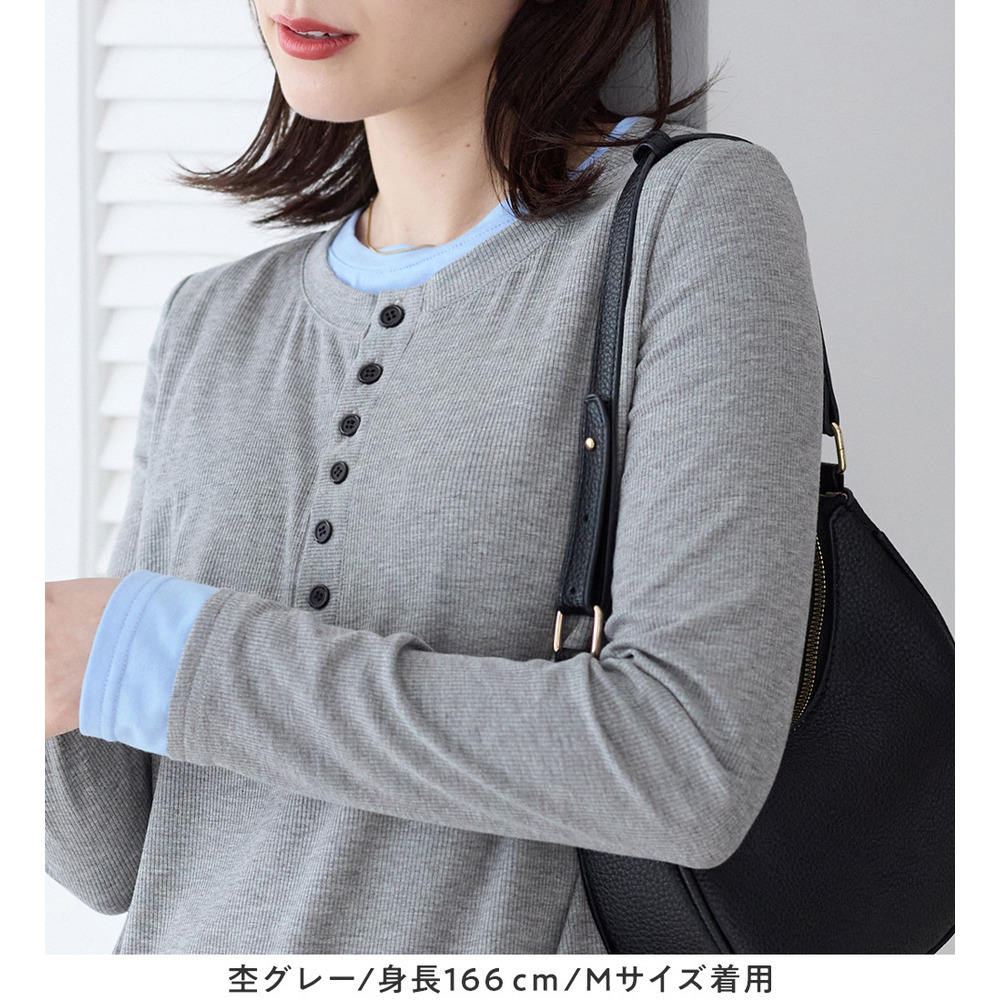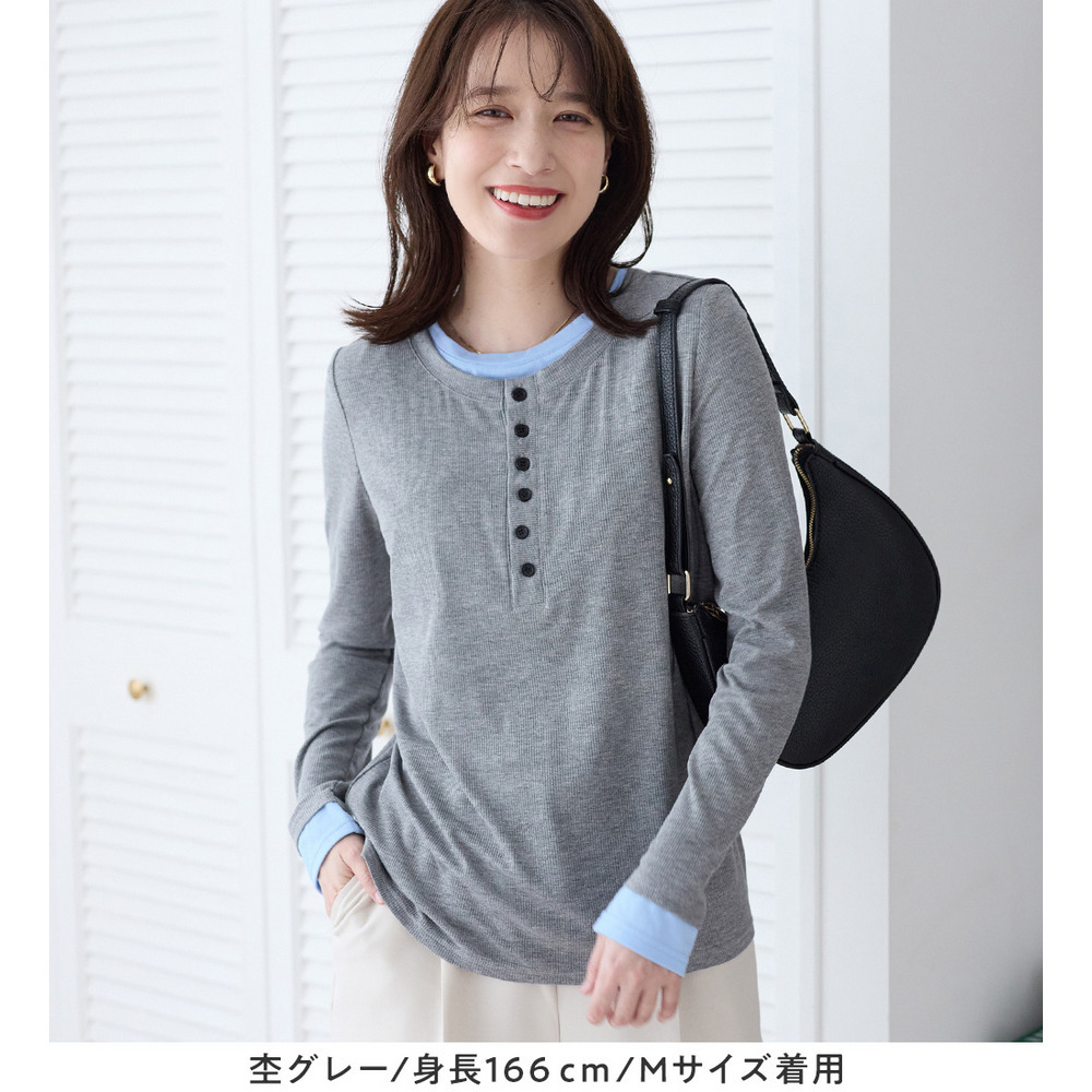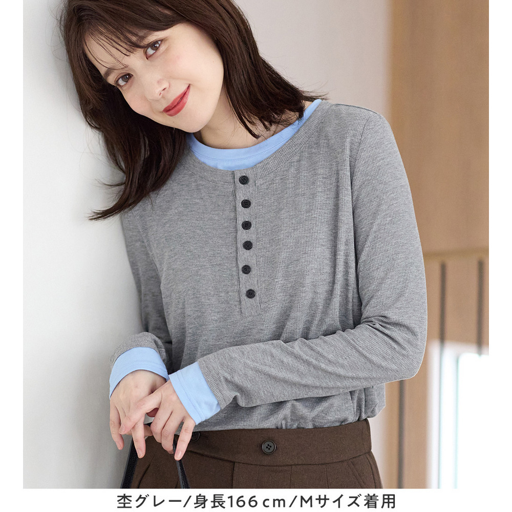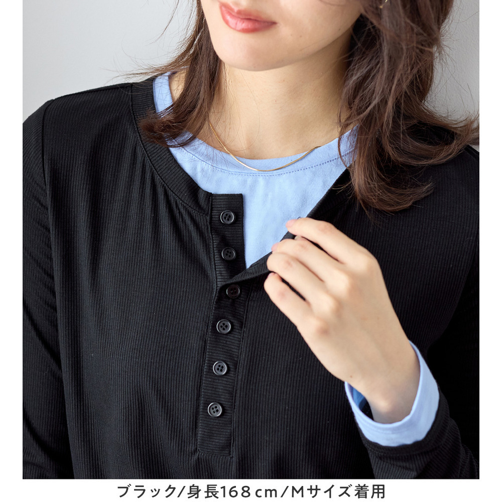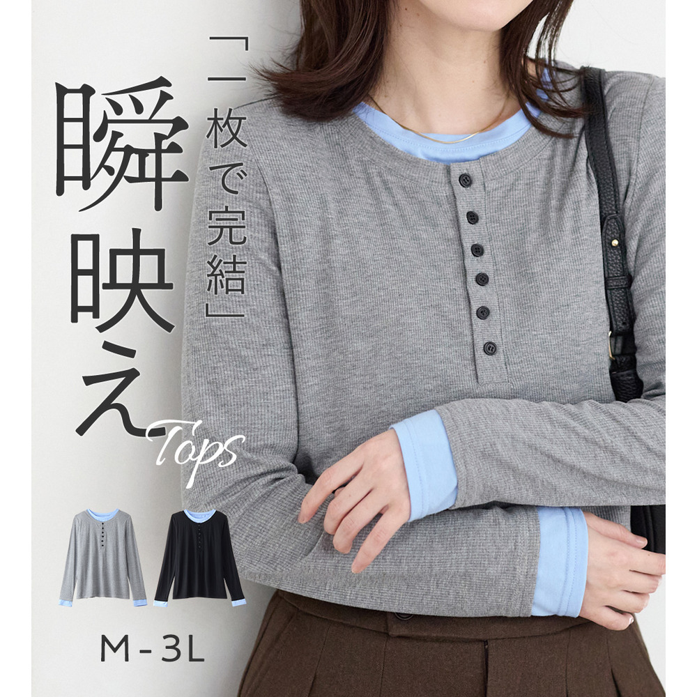1枚着映えレイヤード風ヘンリーネックリブトップス 大きいサイズ レディース