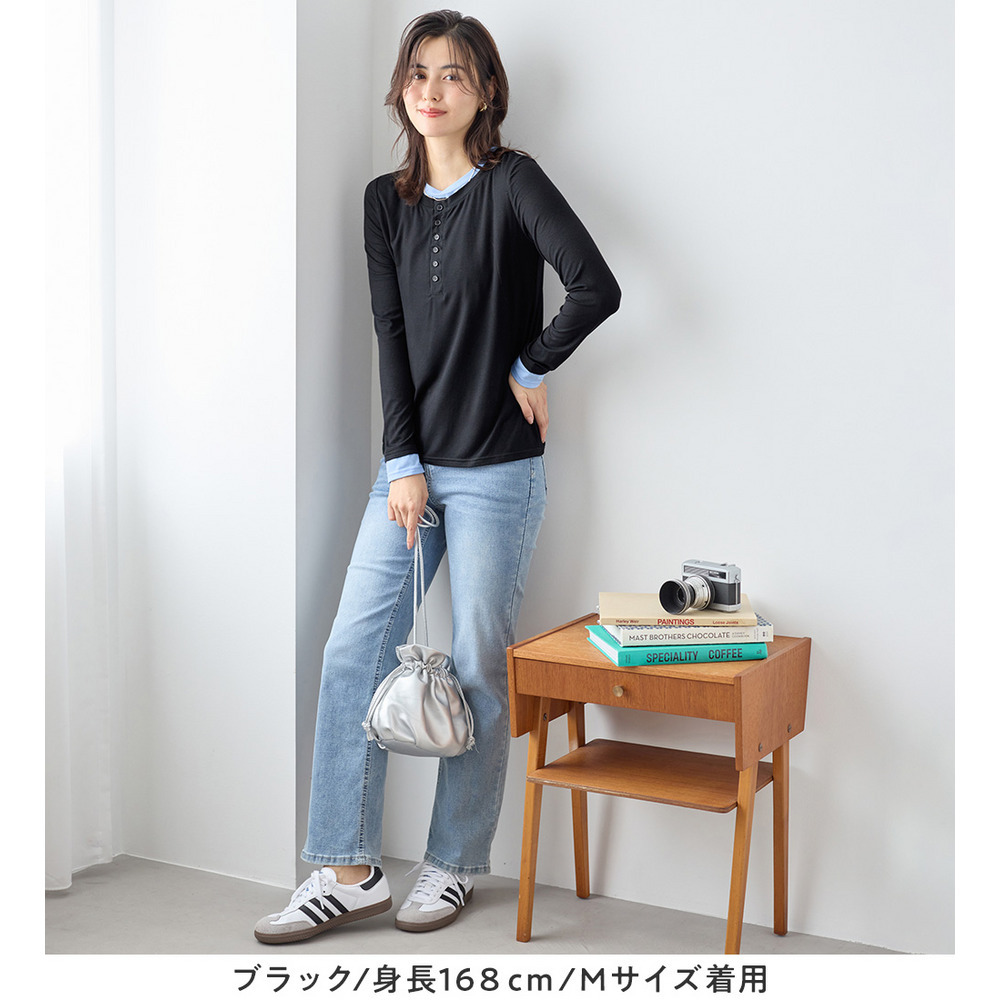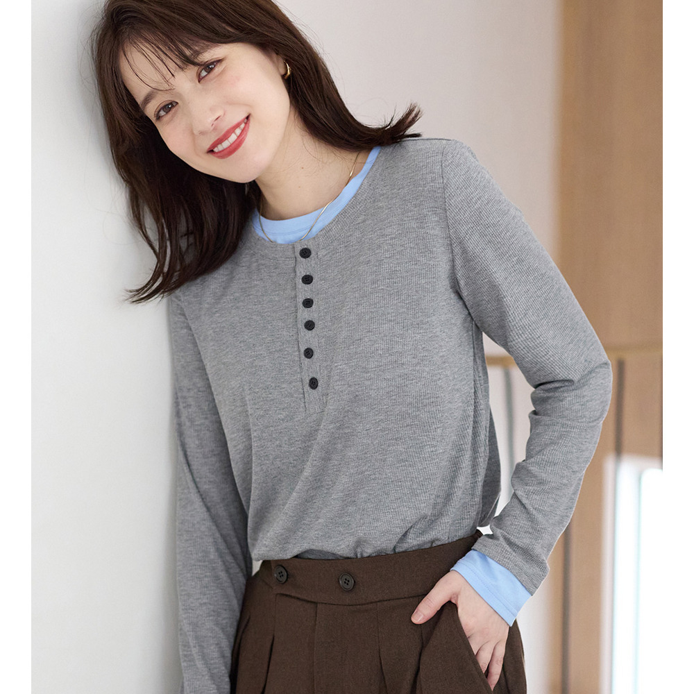 ・トレンドのヘンリーネックデザインを取り入れた配色レイヤードで1枚でも着映えする華やかさ。