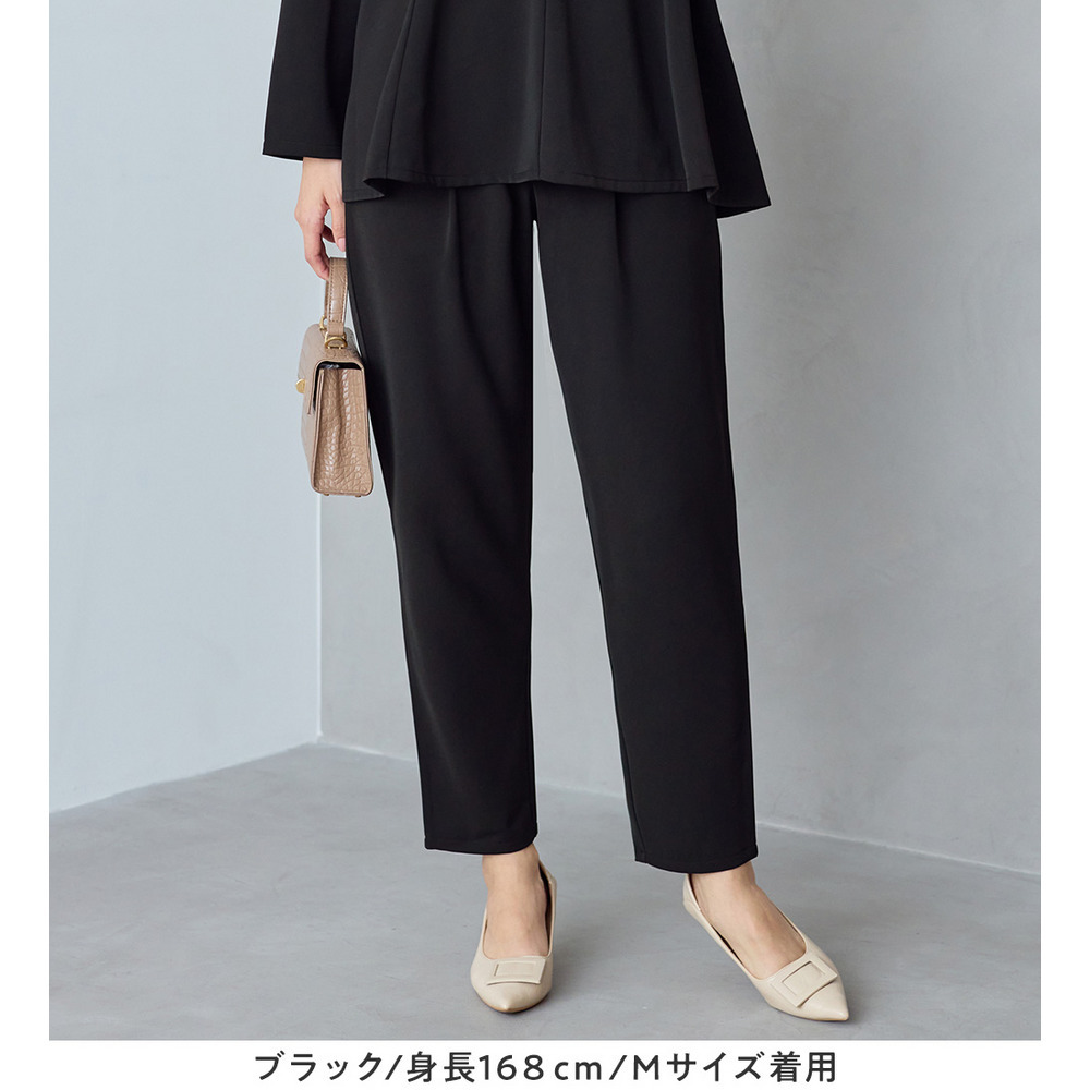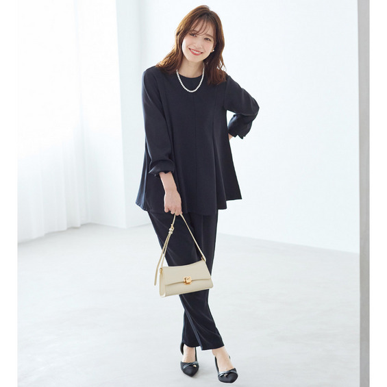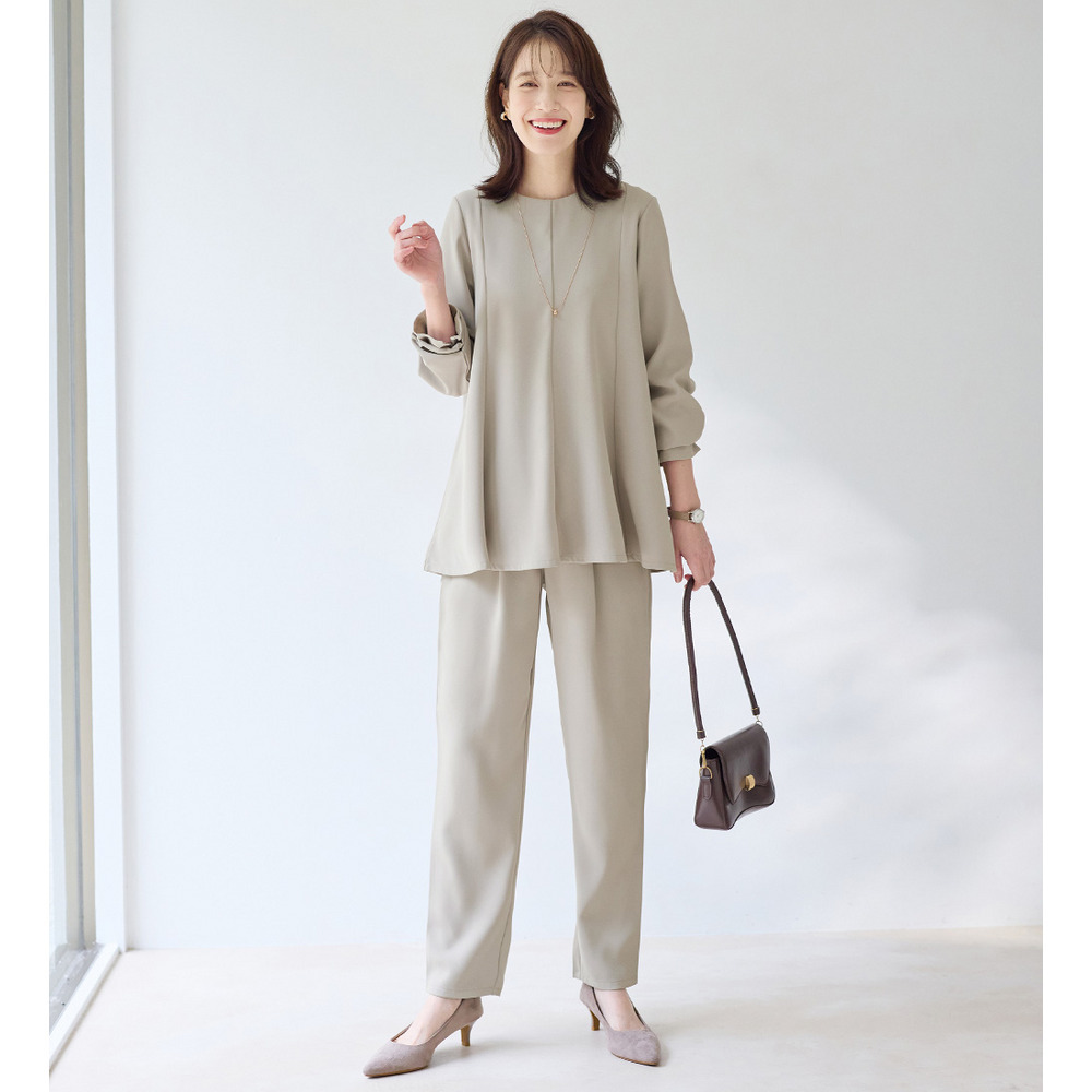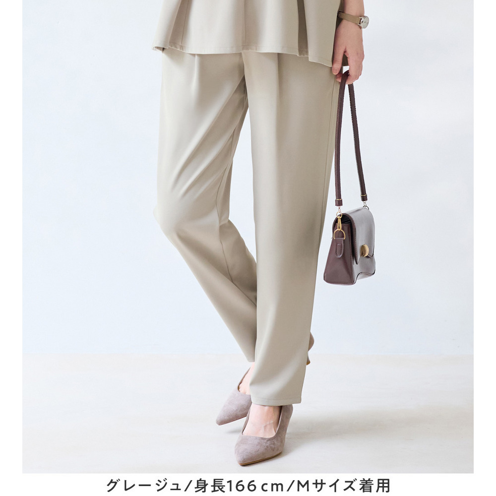 同素材のテーパードパンツとのセットアップスタイルはもちろん、首元や顔まわりにアクセサリーをプラスして華やかさを添えるのもおすすめです。