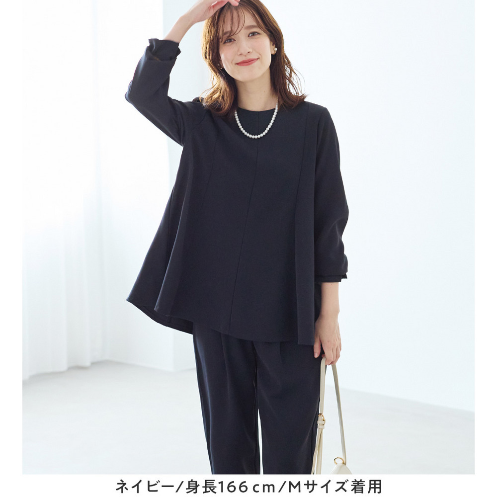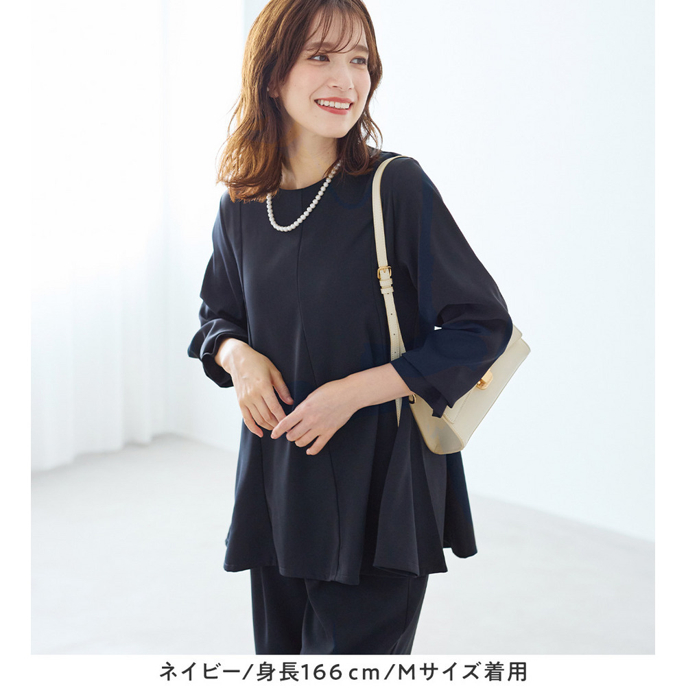 胸下から裾にかけて自然に広がるフレアシルエットが、気になる部分をさりげなくカバーしつつ、すっきりとした印象に見せてくれます。