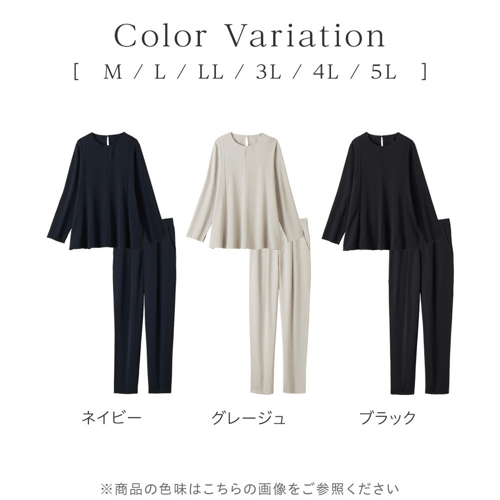 サイズ表記 L LL 3L 4L 5L [トップス]バスト 108 112 116 122 128 [トップス]肩幅 39 40 41 43 45 [トップス]後着丈 65 66 67 69 71 [トップス]袖丈 55.5 56 56.5 57.5 58.5 [ボトムス]ウエスト 70 74 78 84 90 [ボトムス]ヒップ 106 110 114 120 126 [ボトムス]裾幅 17 18 19 20.5 22 [ボトムス]わたり幅 32 33 34 35.5 37 [ボトムス]股下 67 67 67 67 67
