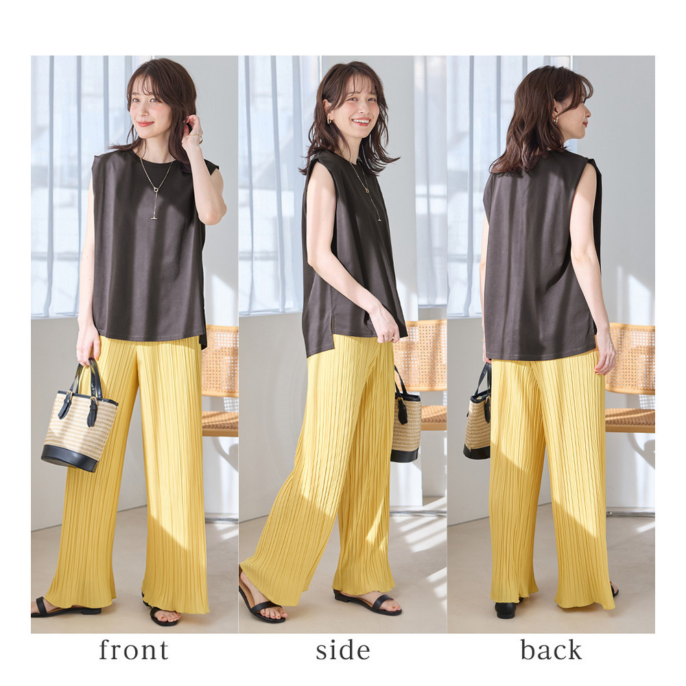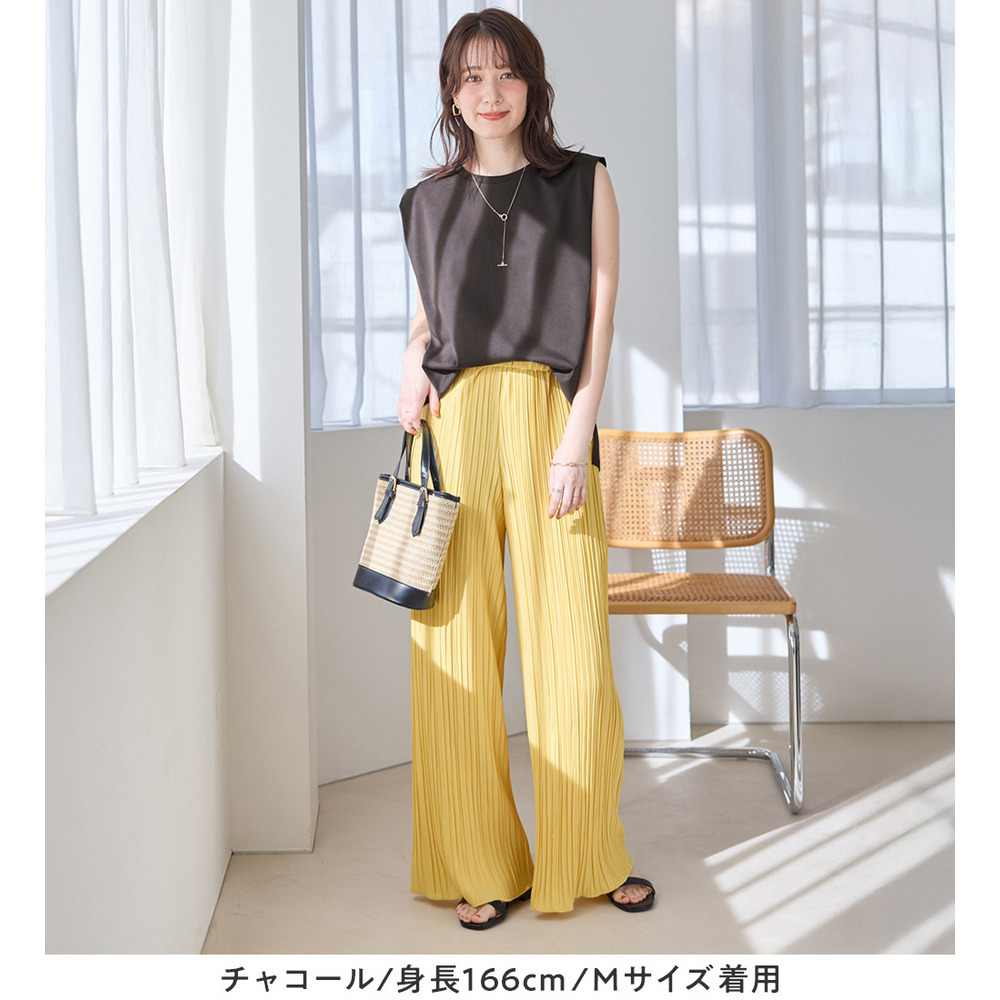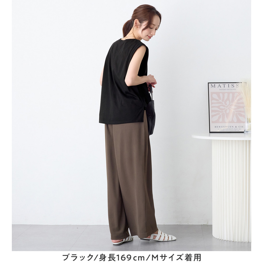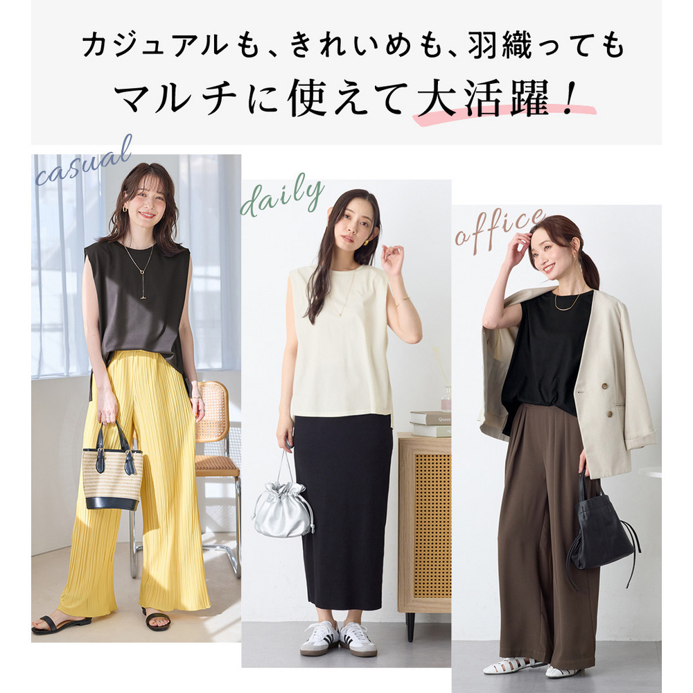 ・スラックス合わせなら、ノースリでもきちんと感のある着こなしが叶う