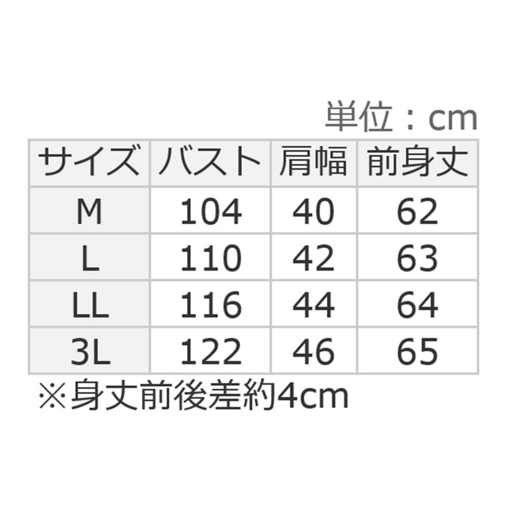 サイズ表記 L LL 3L バスト 110 116 122 肩幅 42 44 46 前身丈 63 64 65