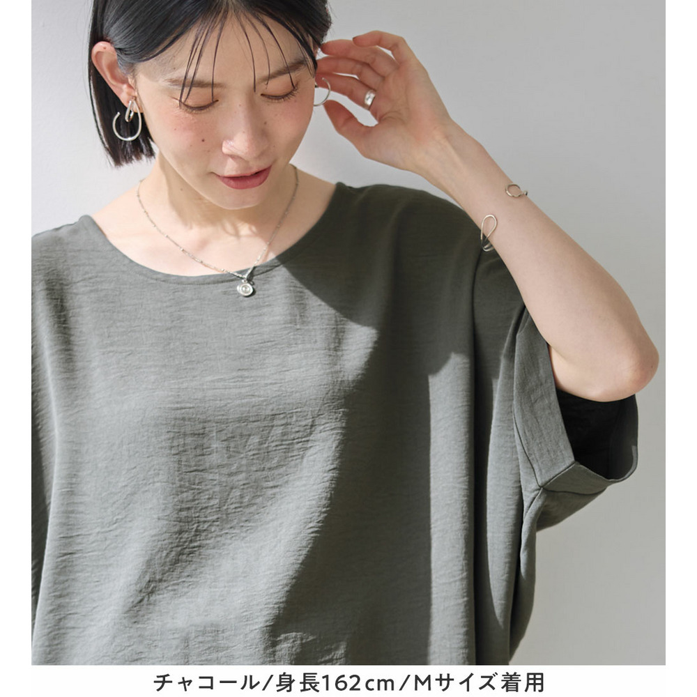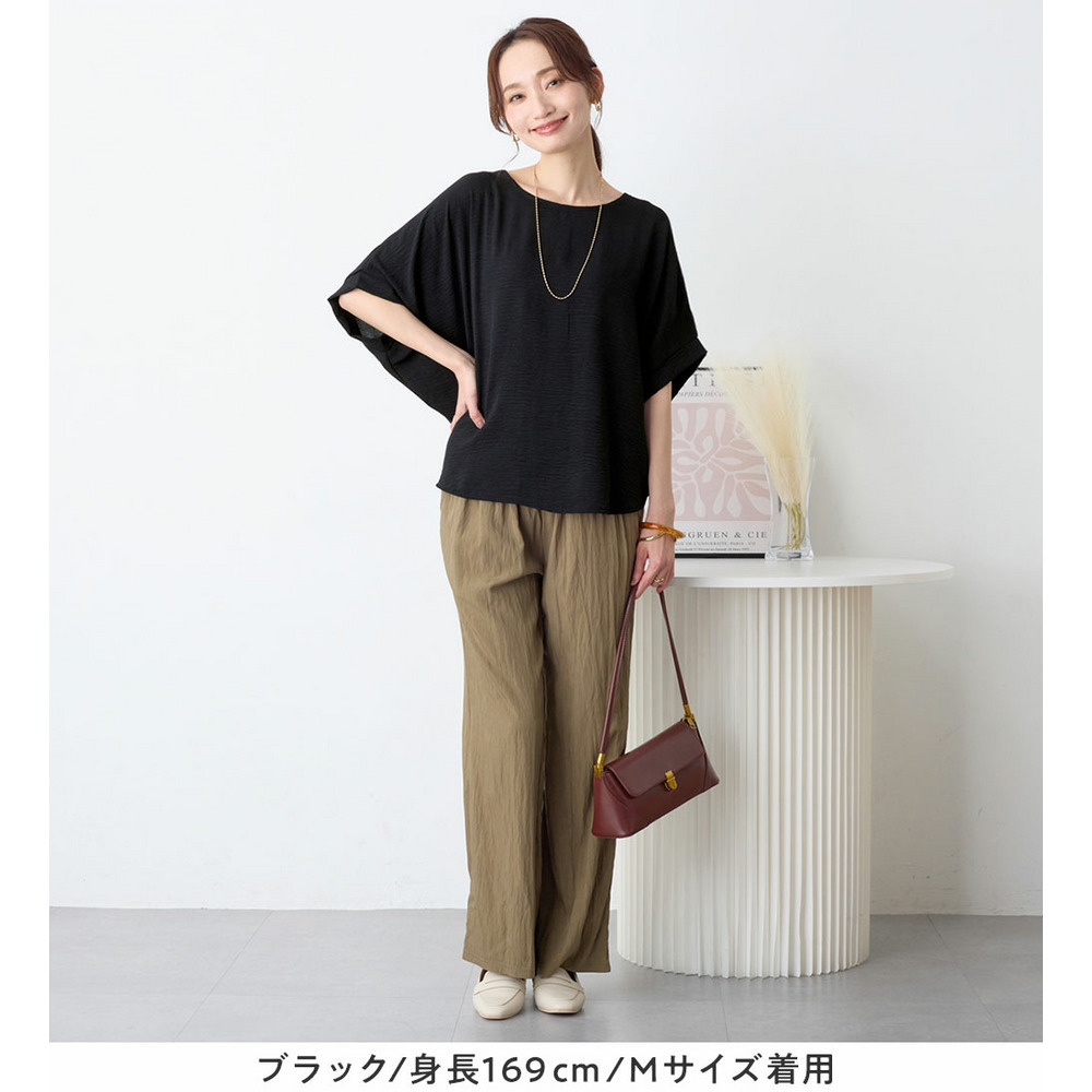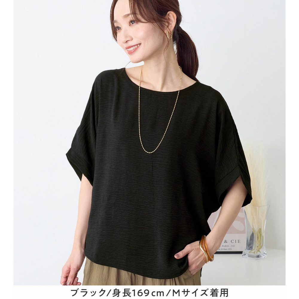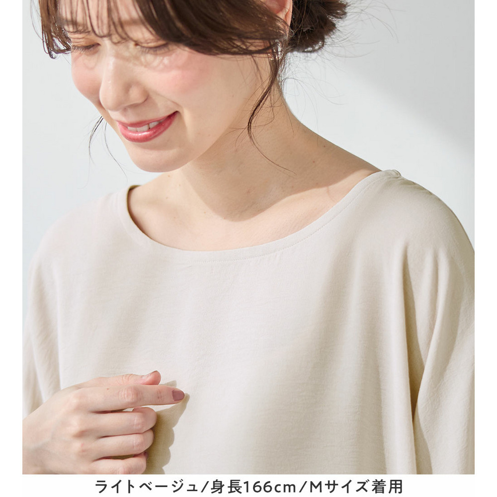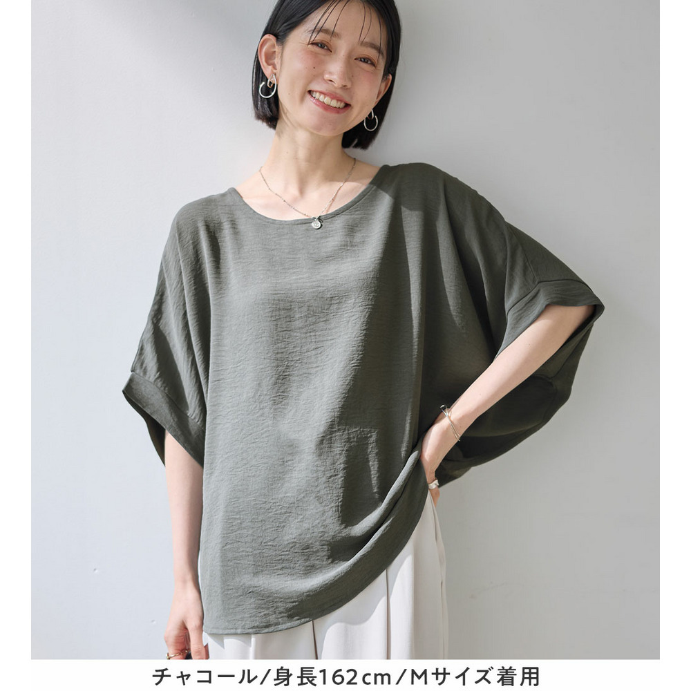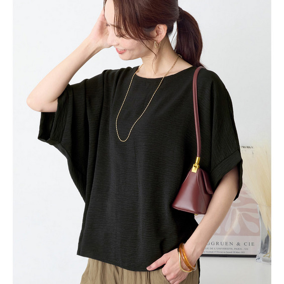 きれいめな素材感:Tシャツとは異なり、とろみのあるブラウス見え素材を使用。カジュアルすぎず上品に着こなせます。