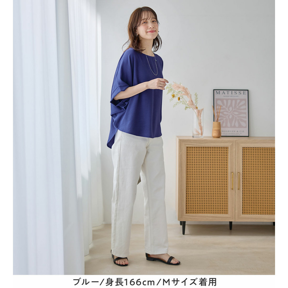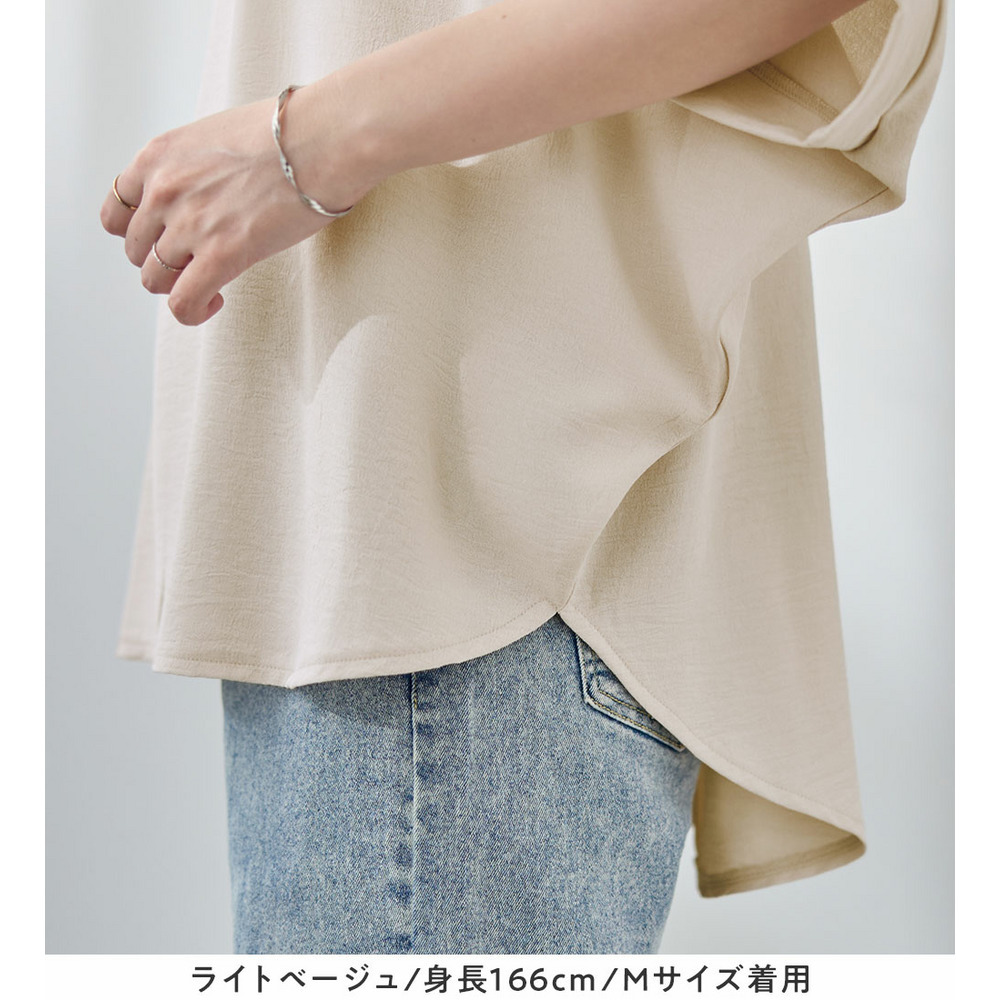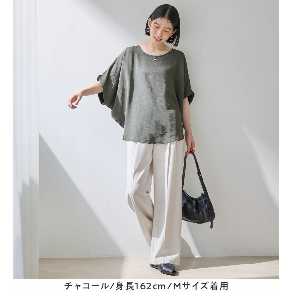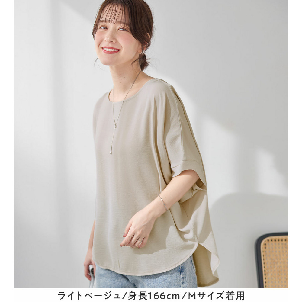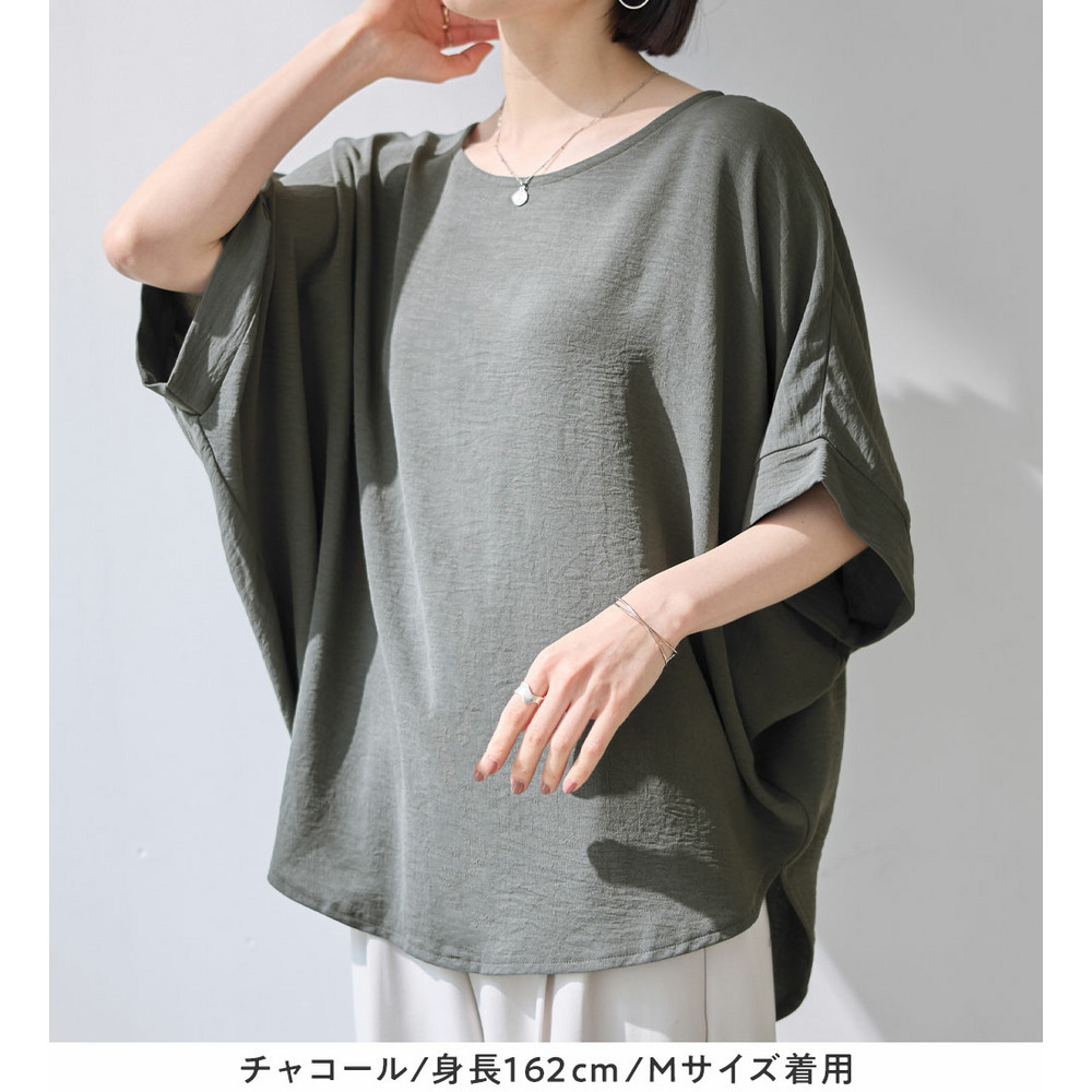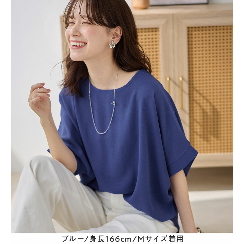 きれいめな素材感:Tシャツとは異なり、とろみのあるブラウス見え素材を使用。カジュアルすぎず上品に着こなせます。