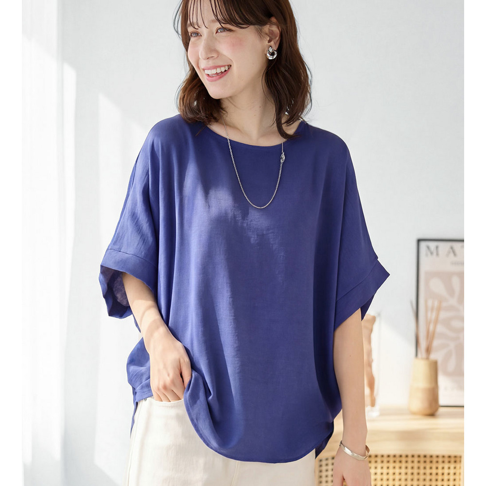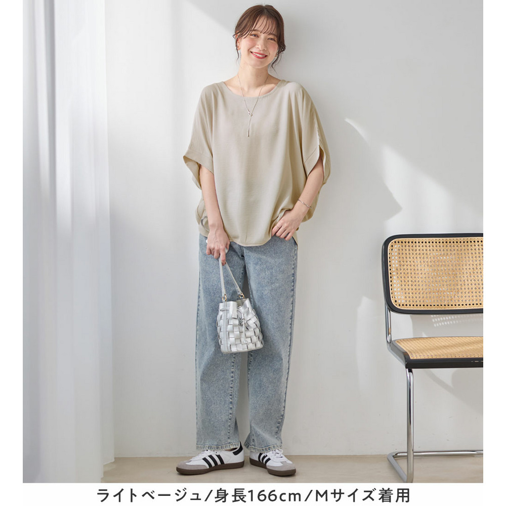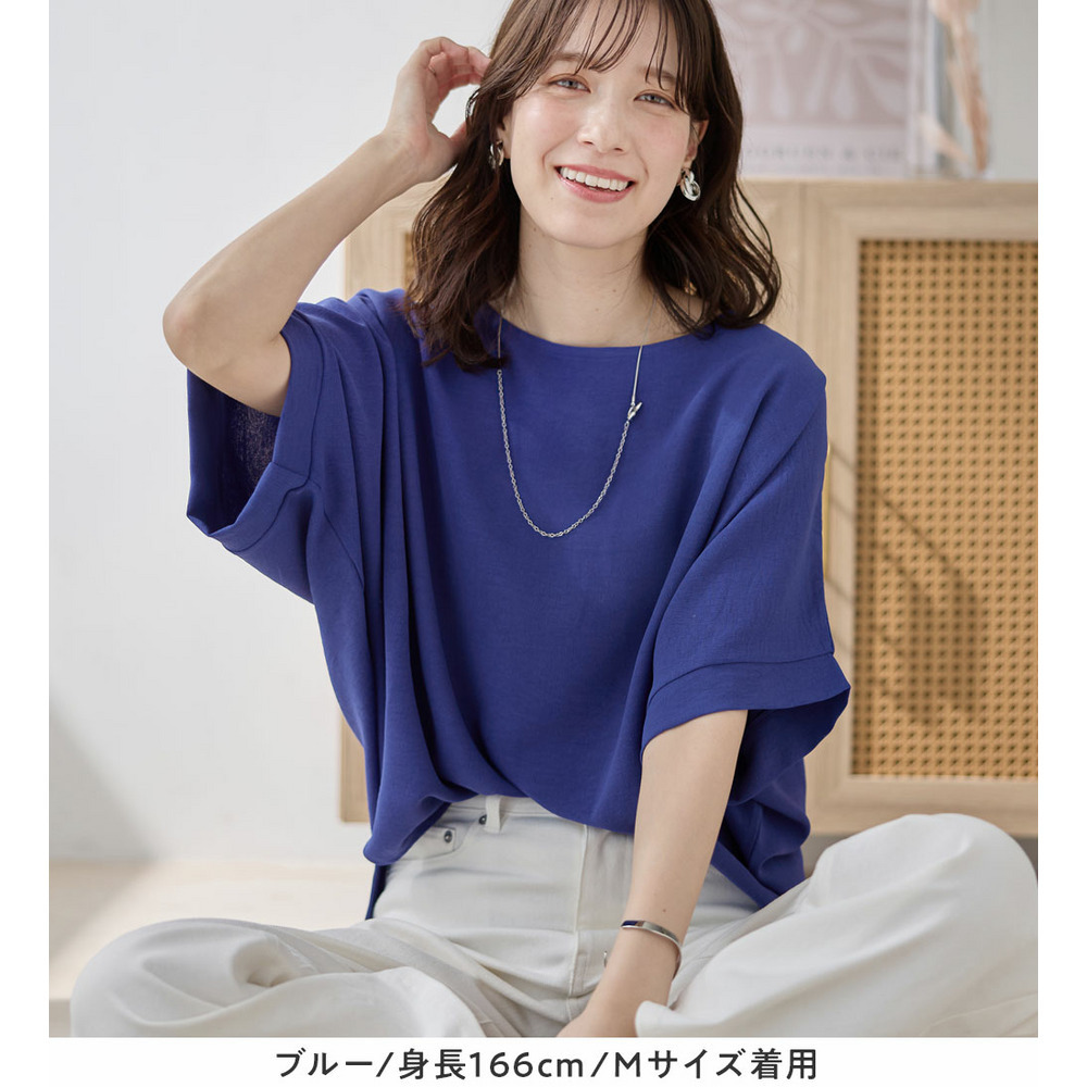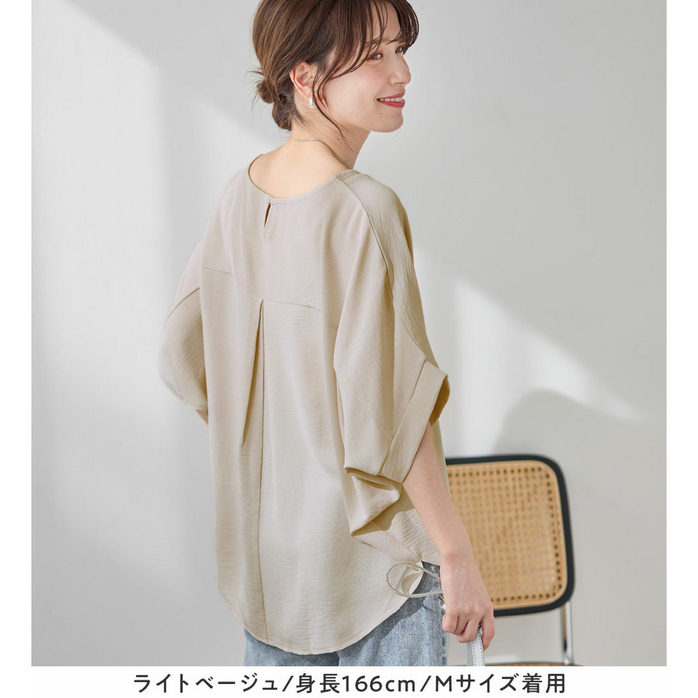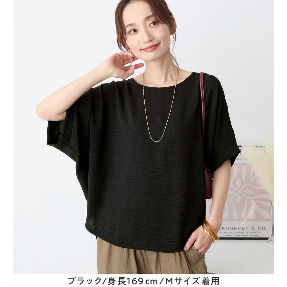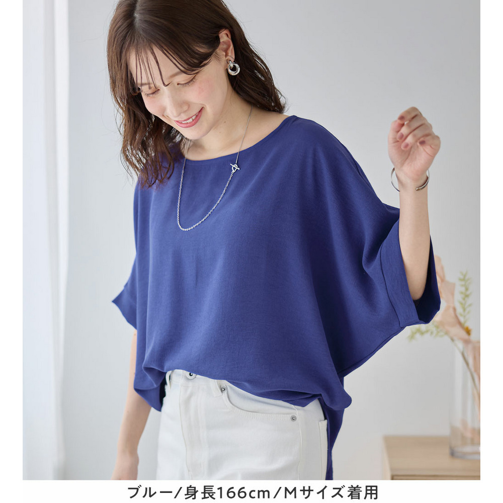 きれいめな素材感:Tシャツとは異なり、とろみのあるブラウス見え素材を使用。カジュアルすぎず上品に着こなせます。