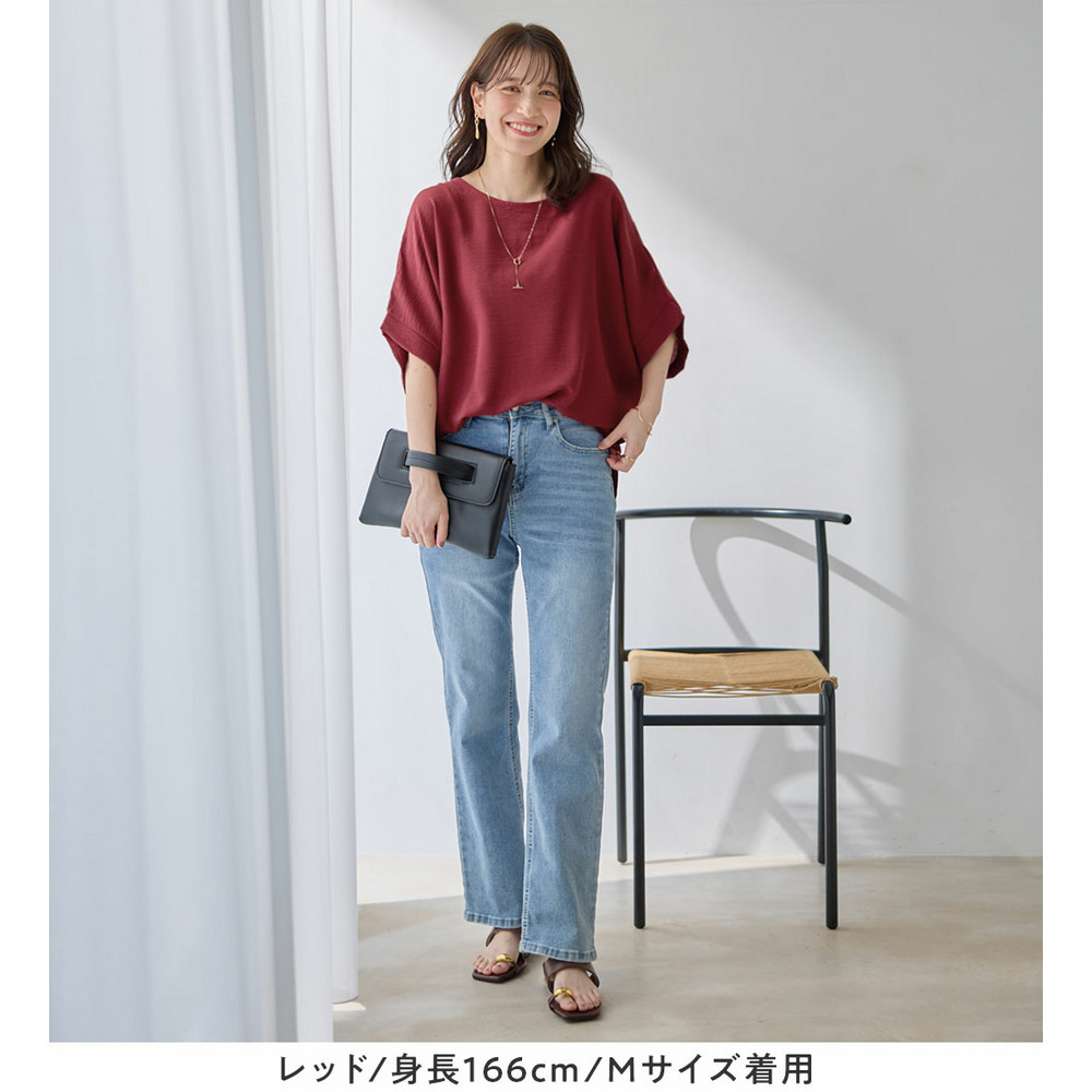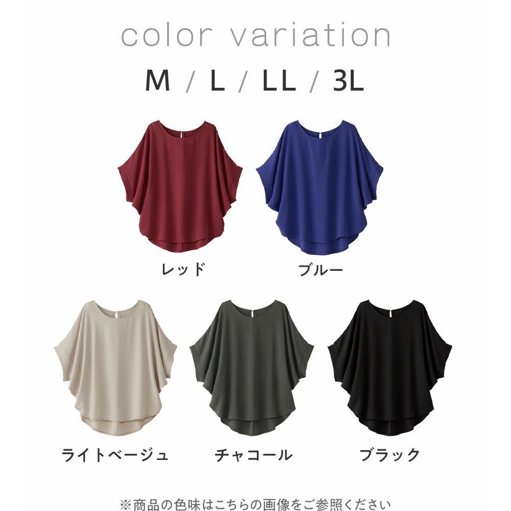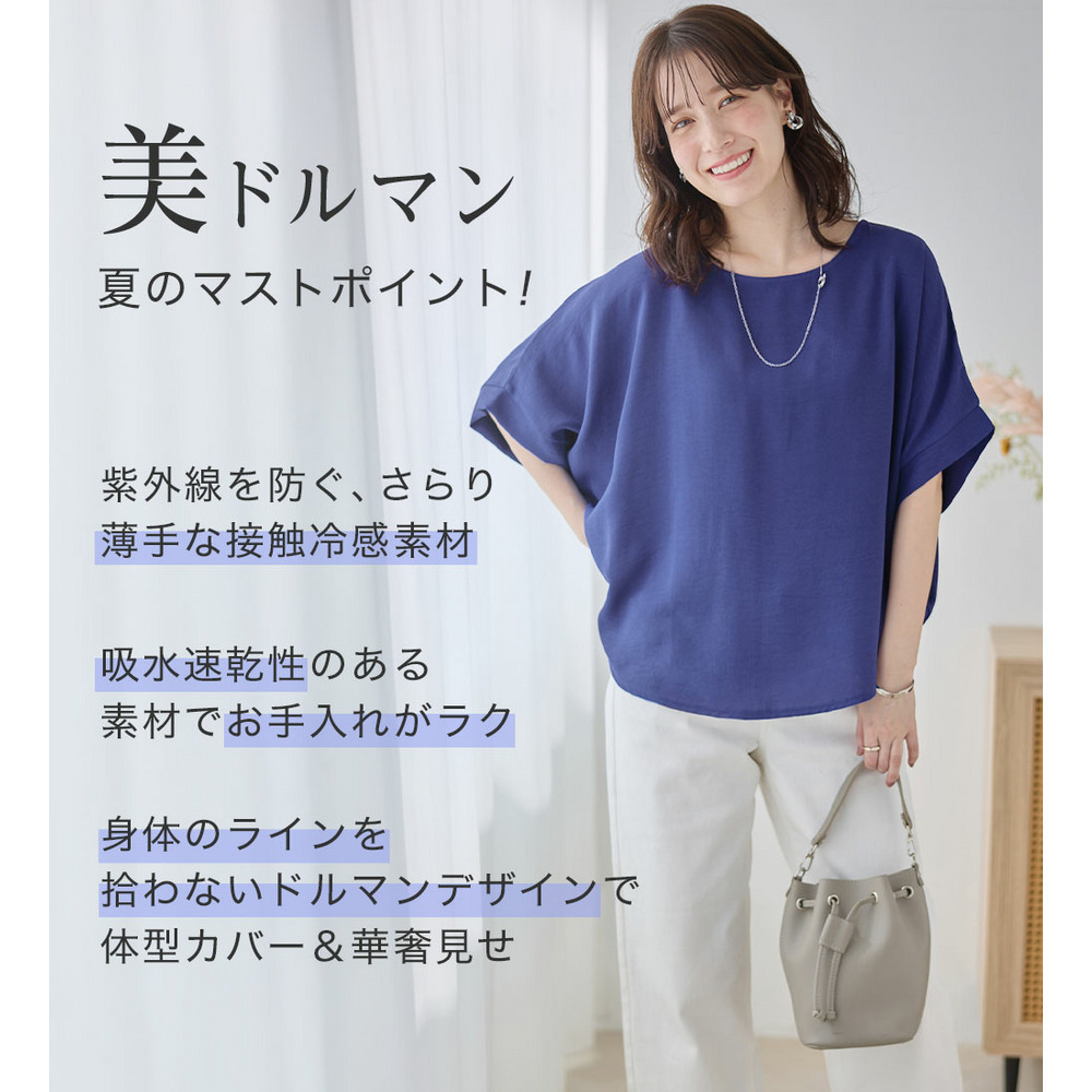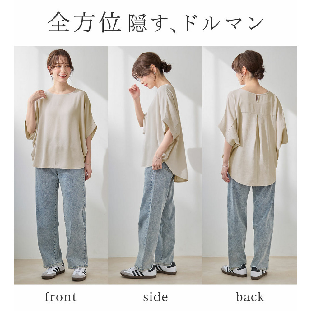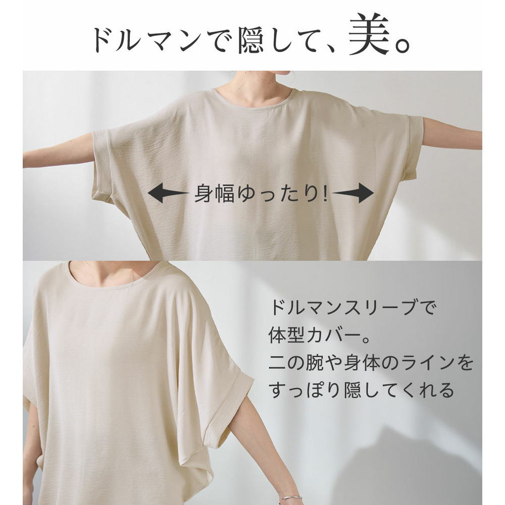 華奢見えを叶えるドルマンスリーブ:身頃から袖にかけてゆったりとしたドルマンデザインを採用。二の腕をさりげなくカバーしつつ、全体的に女性らしい華奢な印象に見せてくれます。